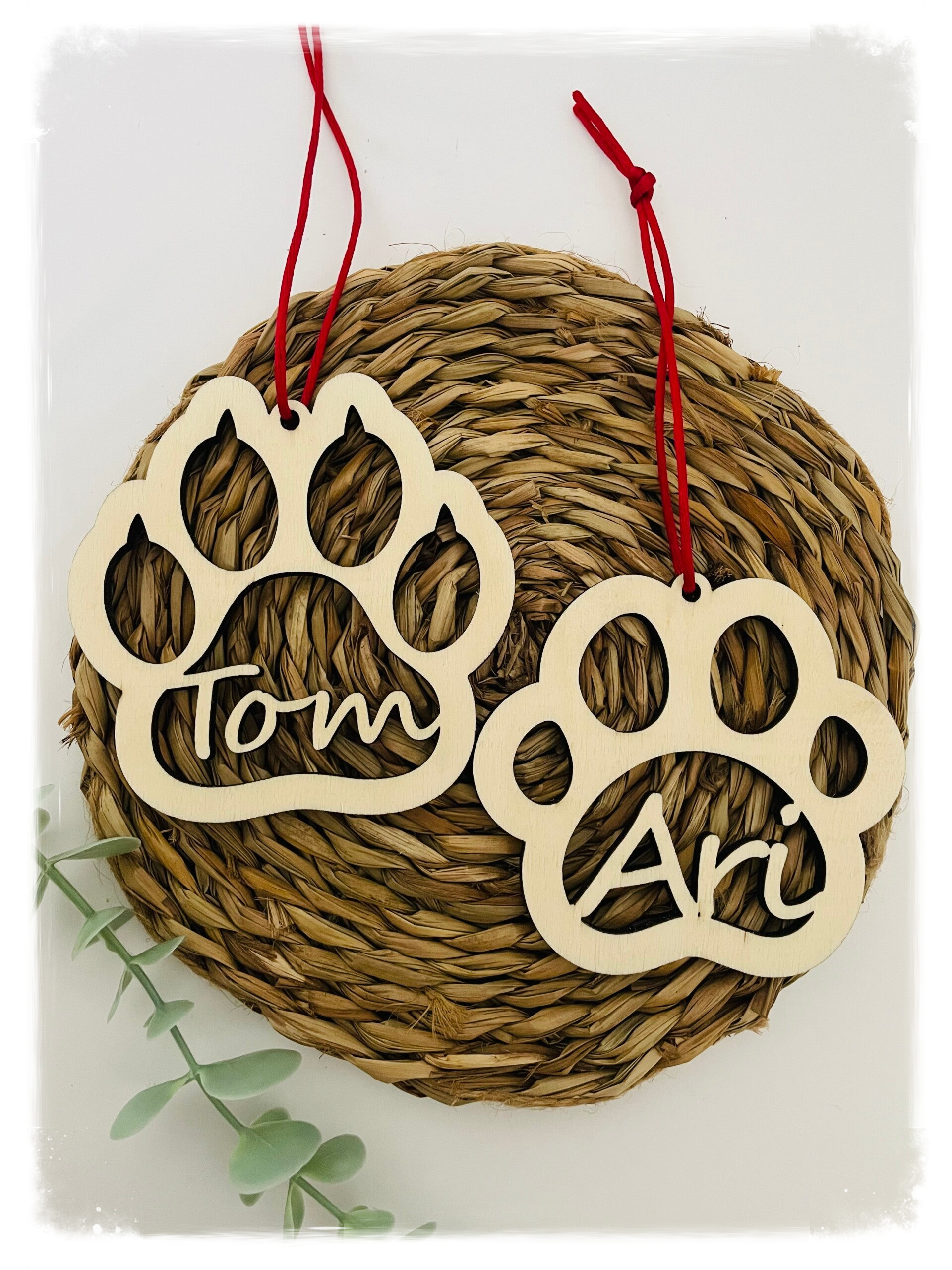 Adorno en forma de huella de perrito o gatito con nombre personalizado para el árbol de Navidad o como elemento decorativo.