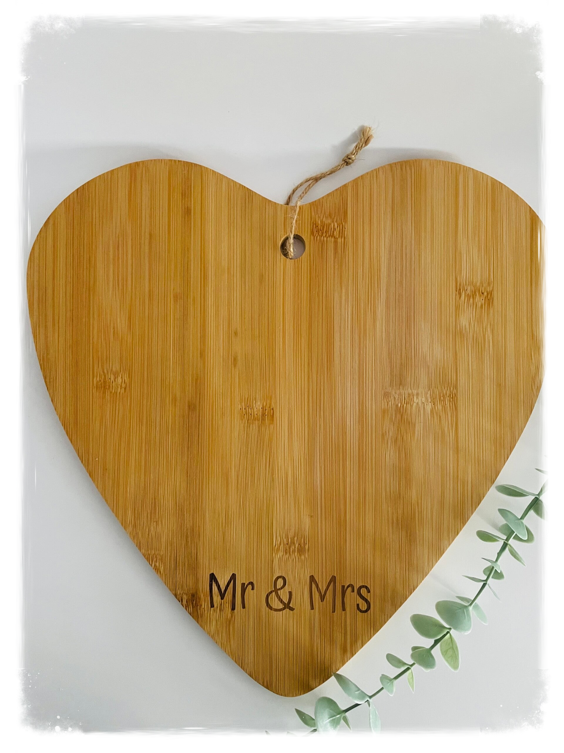 Tabla de cortar de bambú con nombre o texto grabado personalizado, en forma de corazón.