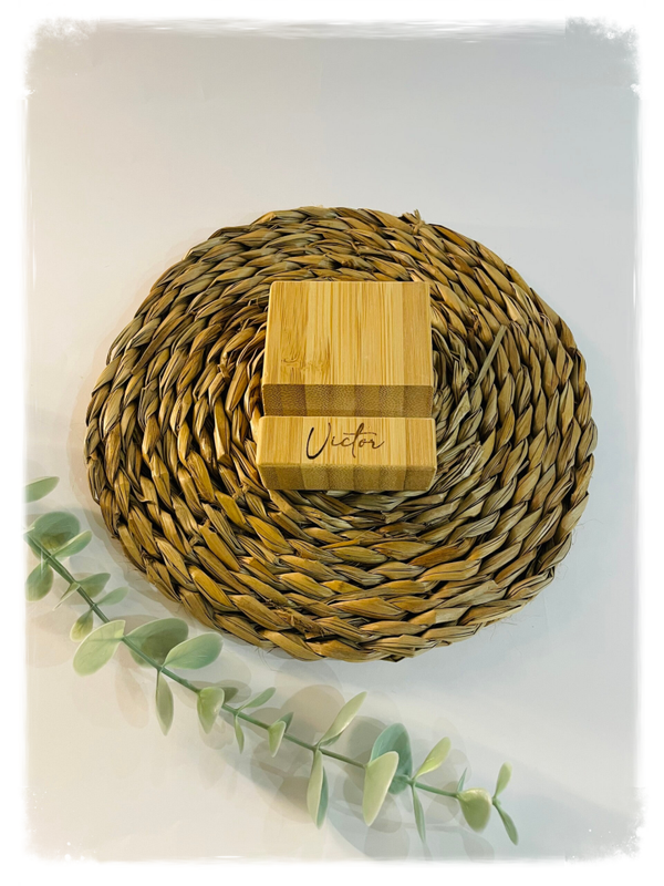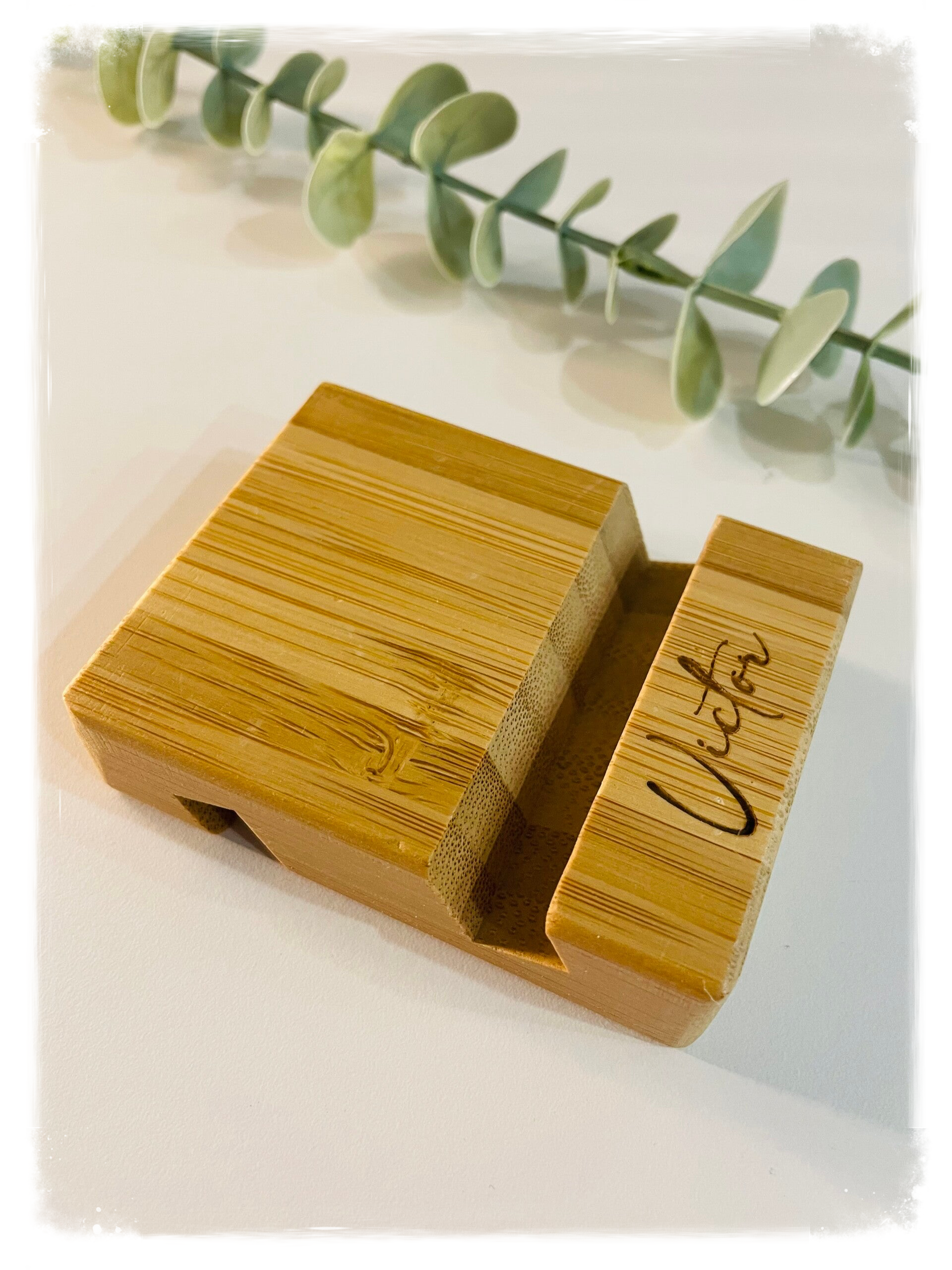 Soporte para móvil y tablet de bambú, personalizado con nombre o frase.