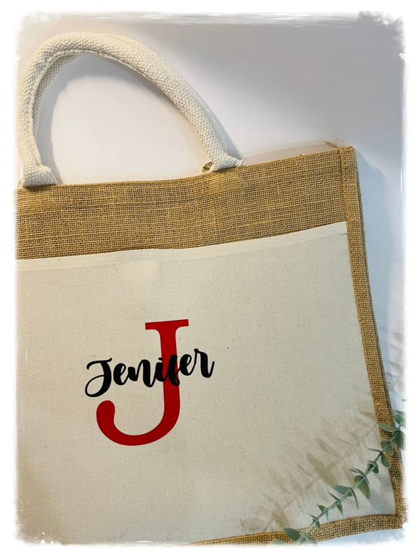Bolsa modelo Helga de algodón y yute laminado ultrarresistente. Con bolsillo exterior con velcro y asas, personalizada con nombre.