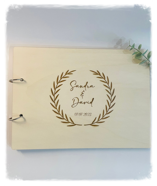 Libro de firmas personalizado con 40 hojas blancas (80 páginas) DINA4 del 160gr, para que sus invitados puedan plasmar sus mensajes.