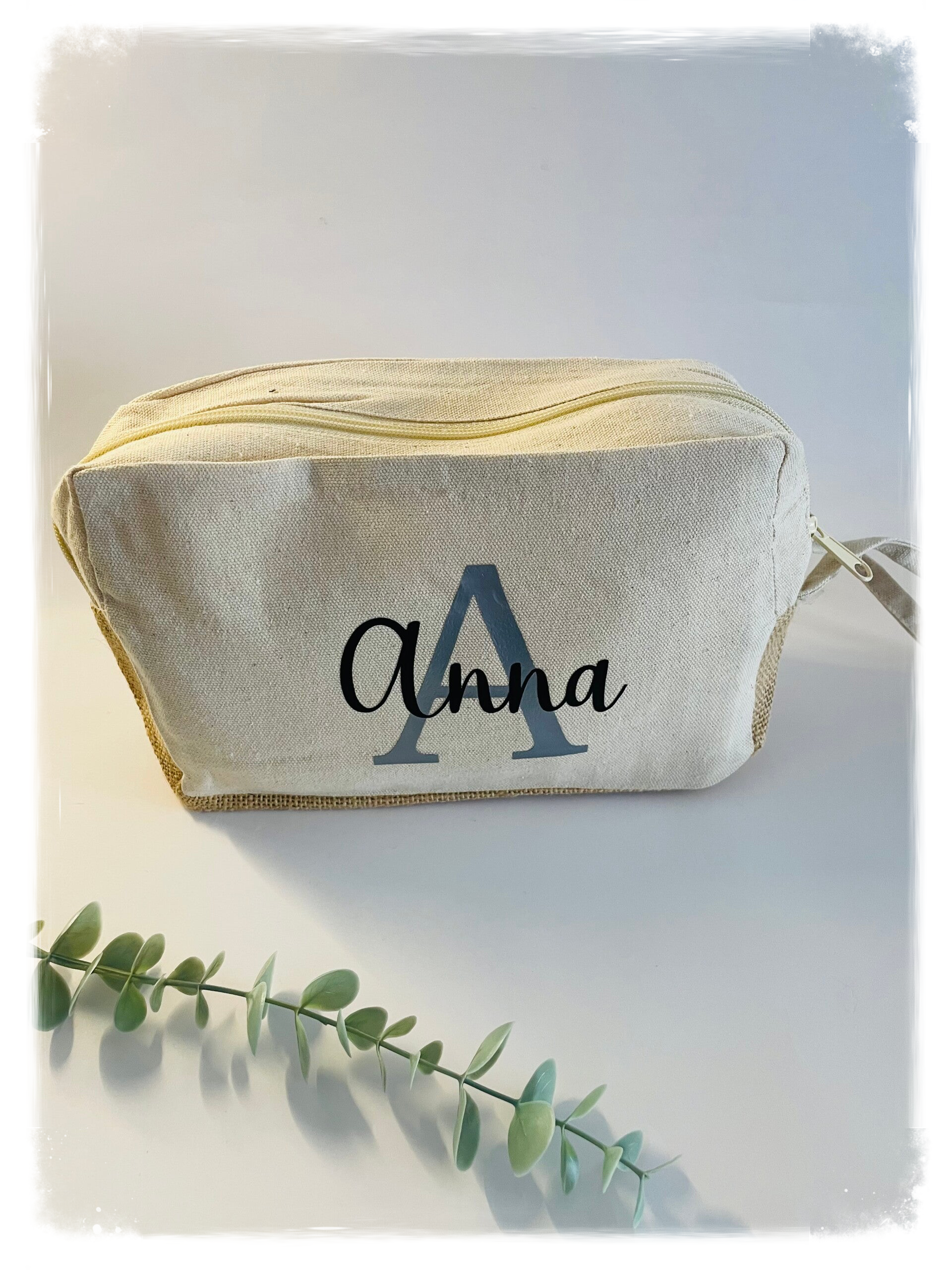 Neceser con asa, fabricado en algodón con base de yute, personalizado con nombre e inicial en vinilo textil.