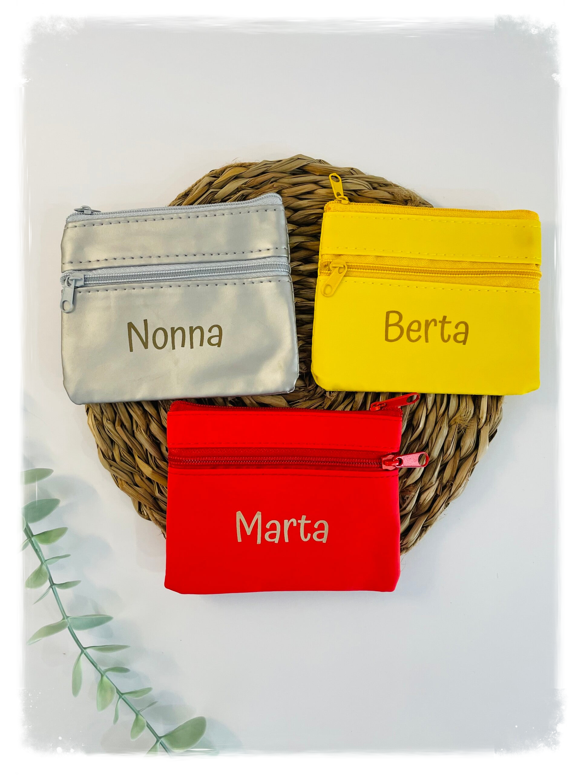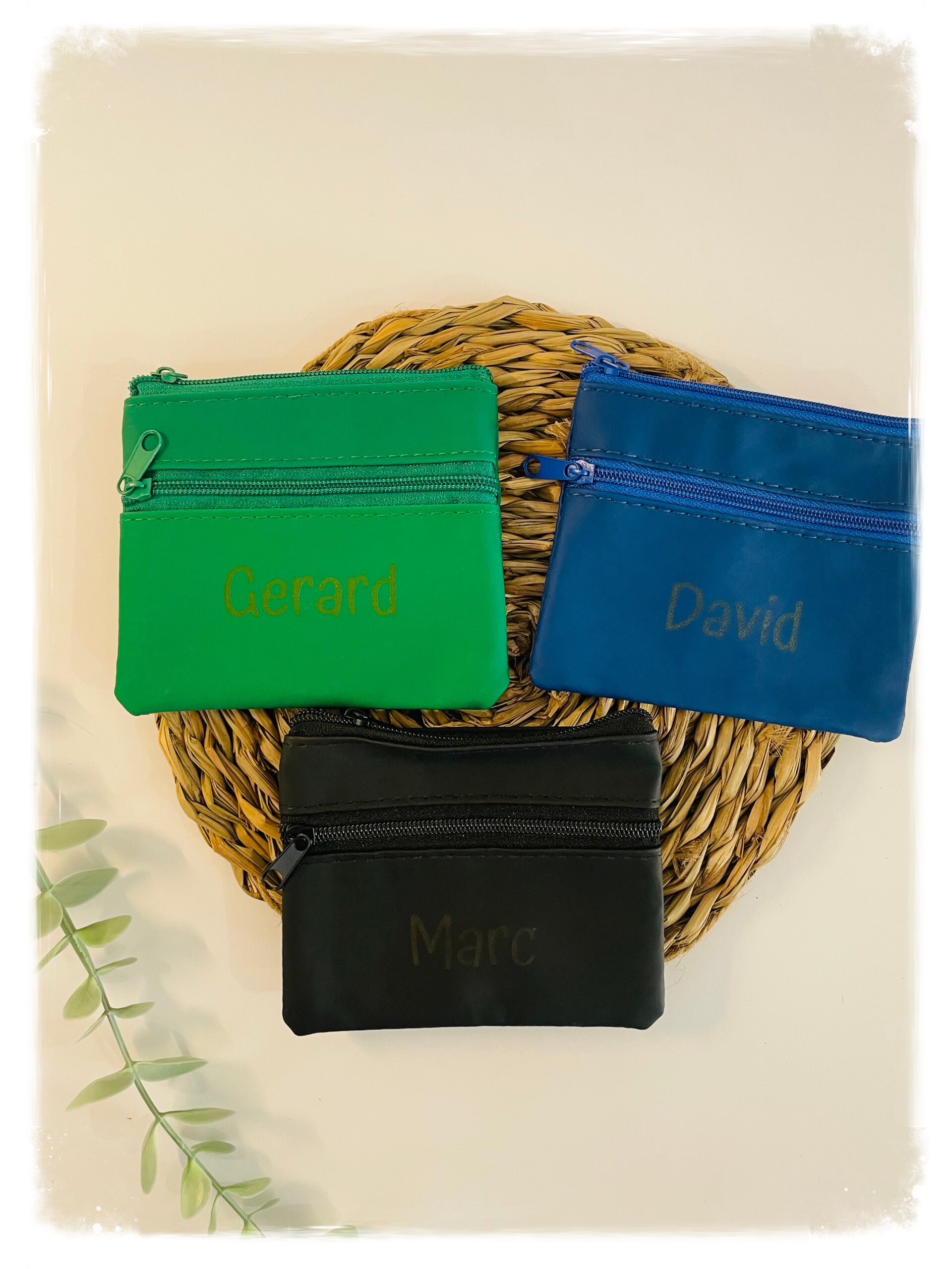 Monedero de polipiel con dos cremalleras, personalizado con nombre grabado a láser. Disponible en varios colores.
