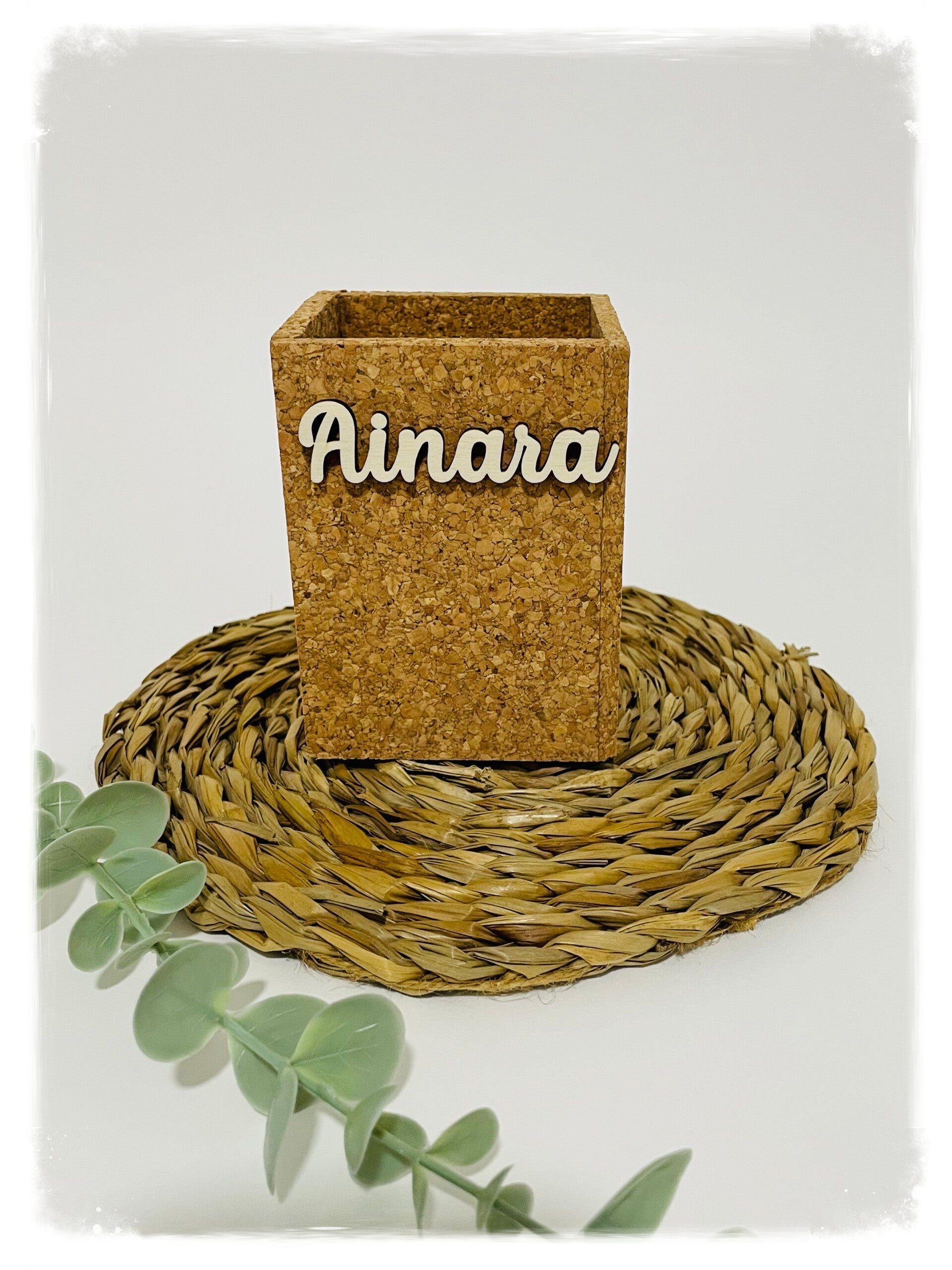 Portalápices de corcho en forma de cubo, personalizado con nombre de madera en relieve.