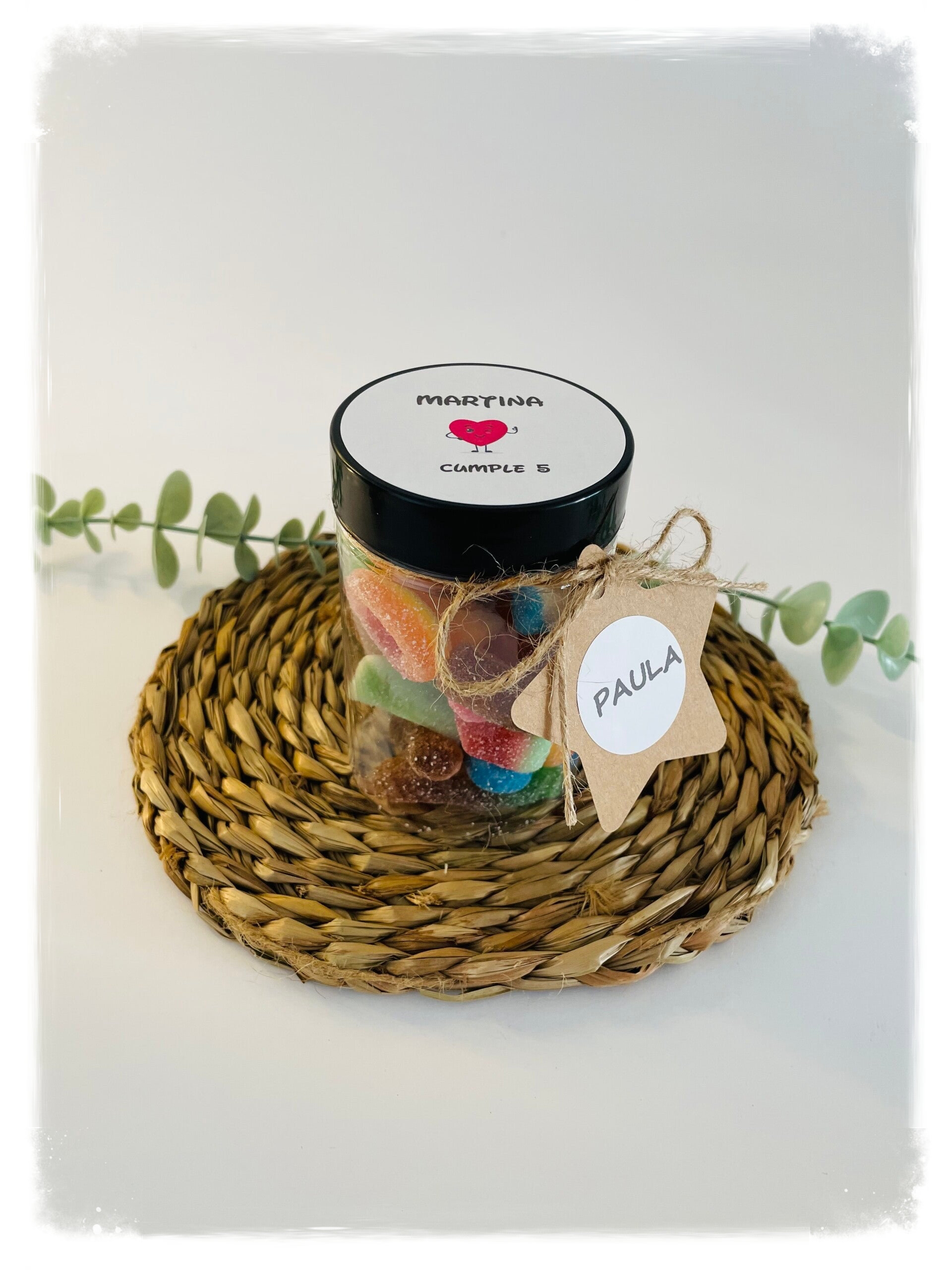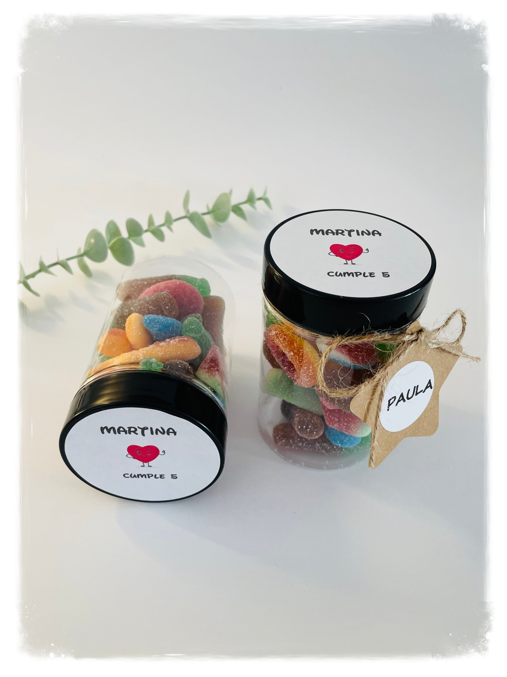 Tarro de plástico PET apto para alimentos con 150 gramos de gominolas personalizado con pegatina y nombre.