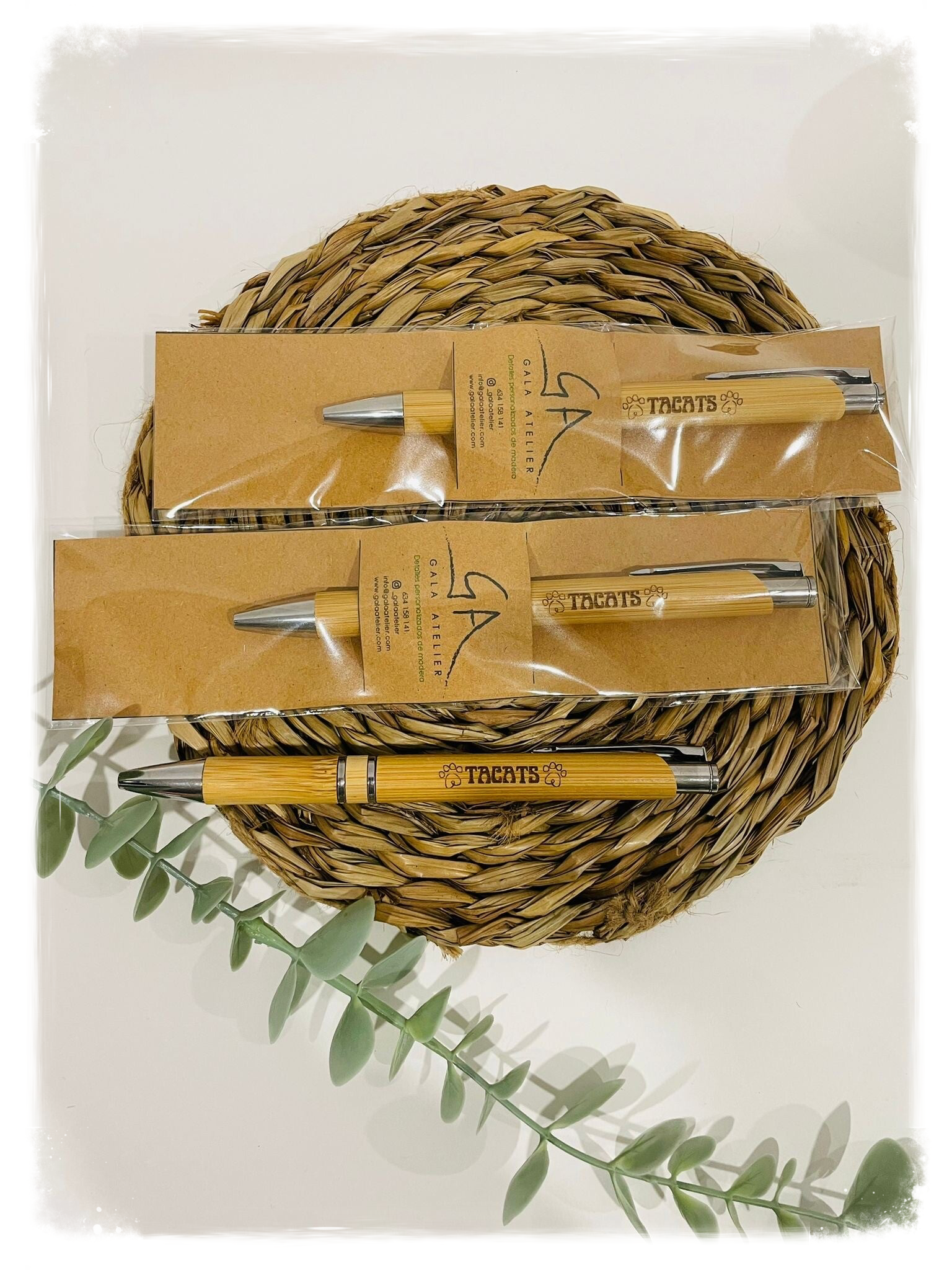 Bolígrafo ecológico en bambú con detalles cromados, personalizado con su logotipo grabado a láser.