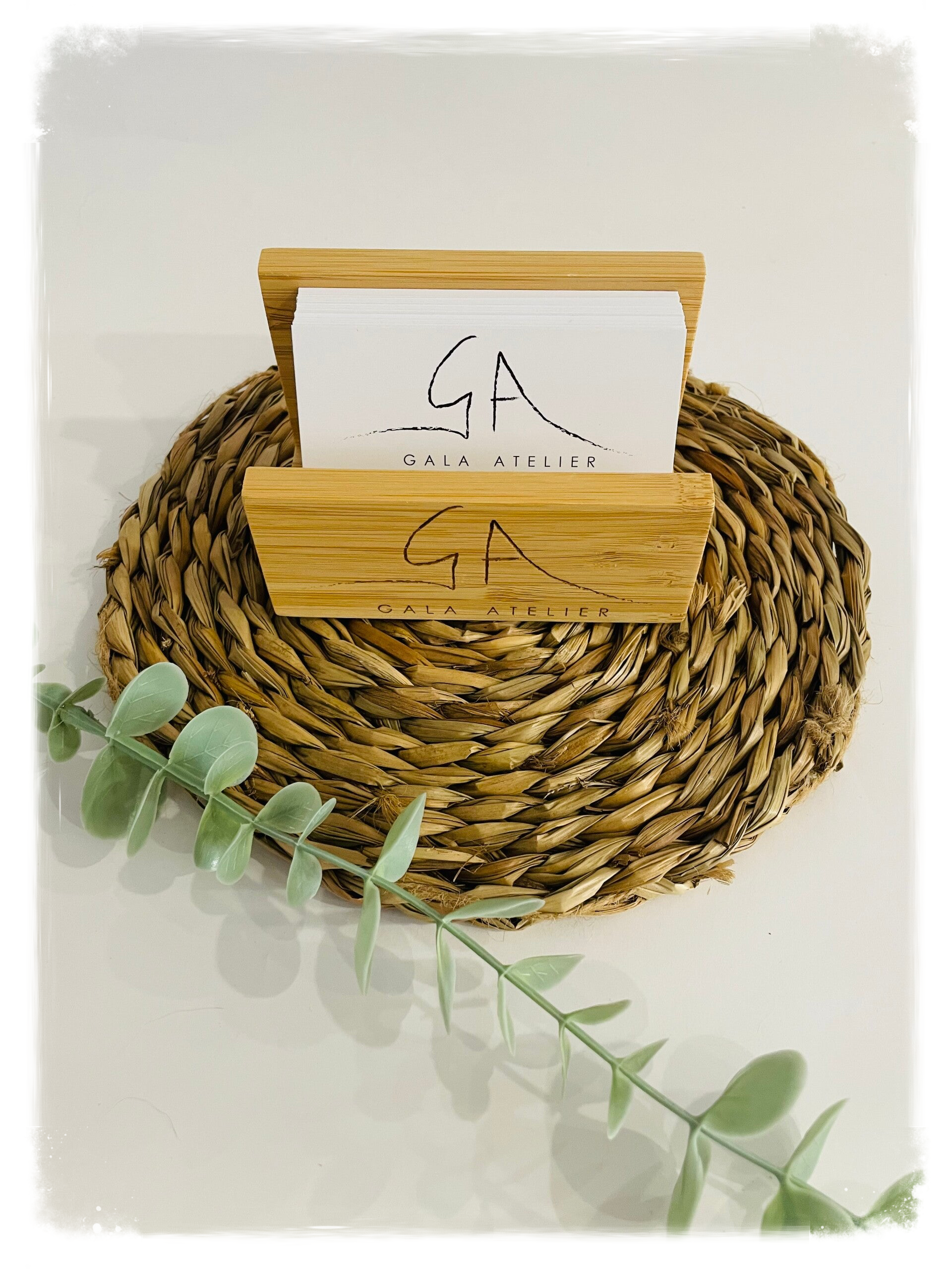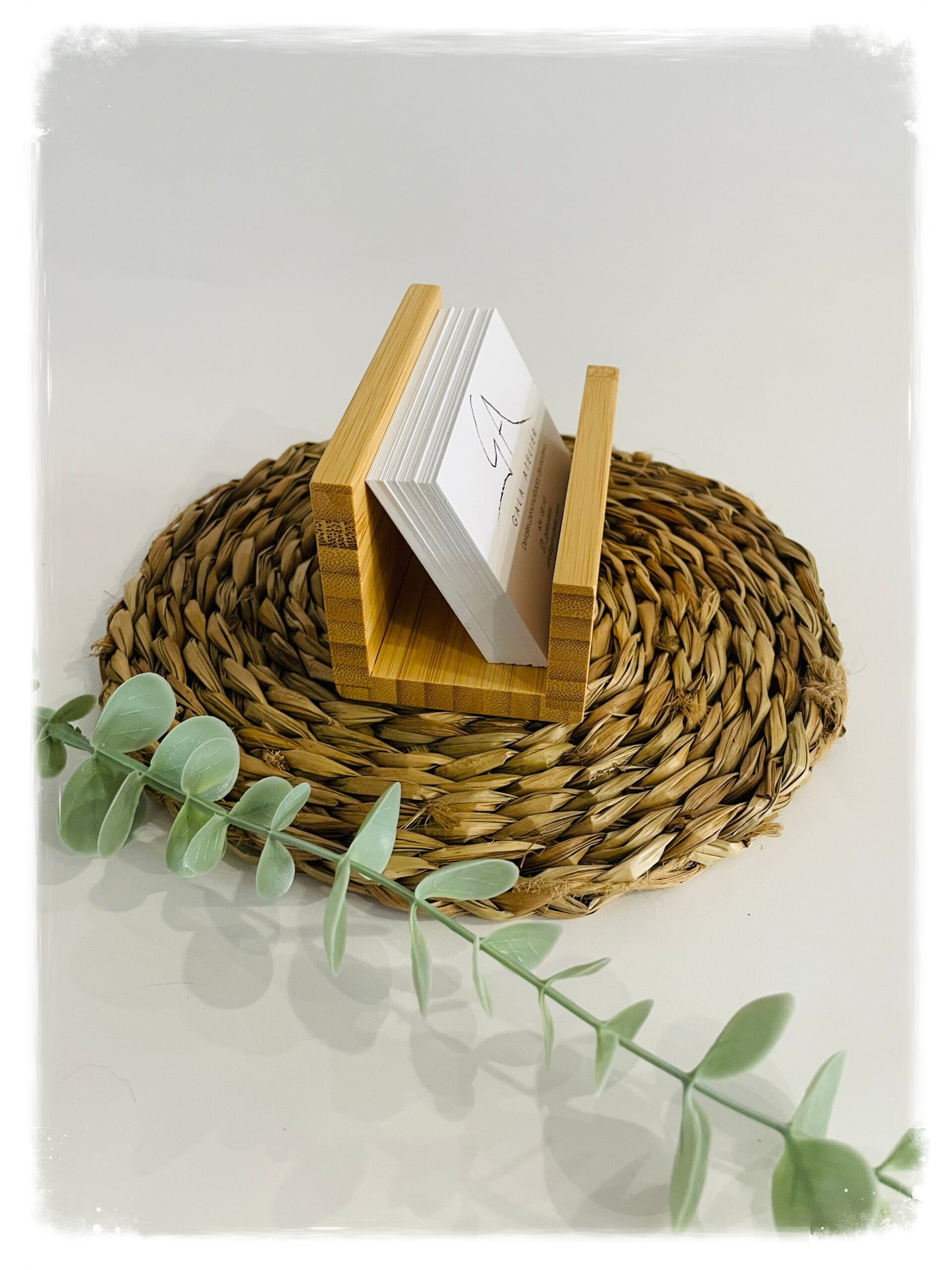 Soporte de bambú para tarjetas, personalizado.