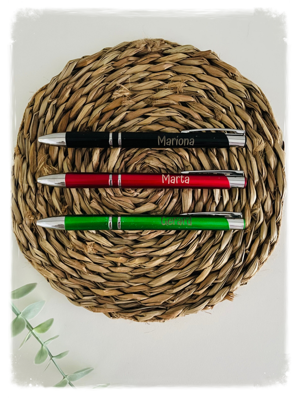 Bolígrafo de plástico con detalles cromados, personalizado con grabación a láser.