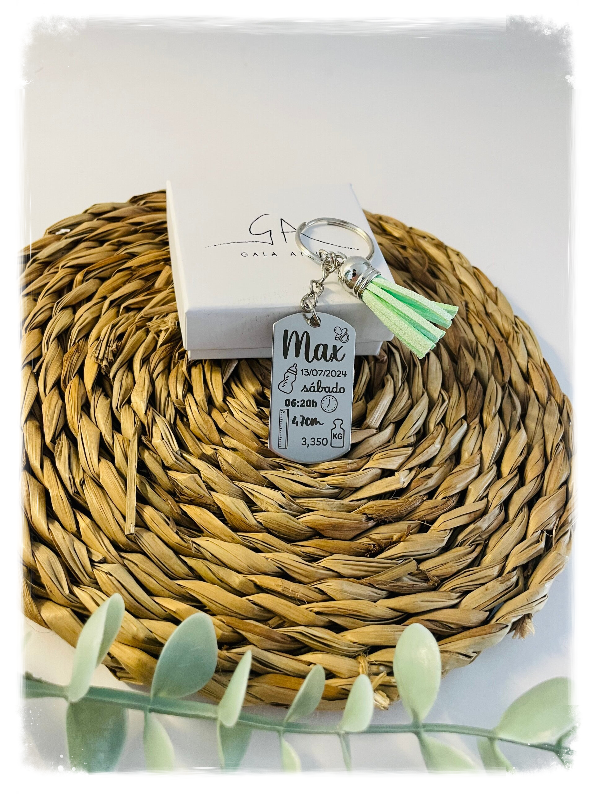 Llavero de acero inoxidable rectangular, personalizado con grabado a láser, y con borla de color a elegir.