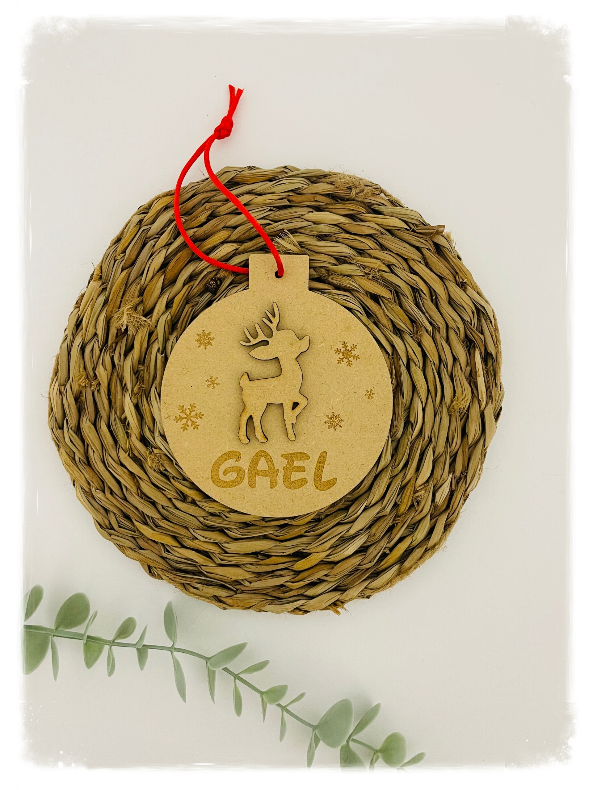 Bola de madera de Navidad de 10cm, con reno en relieve, personalizada con nombre.