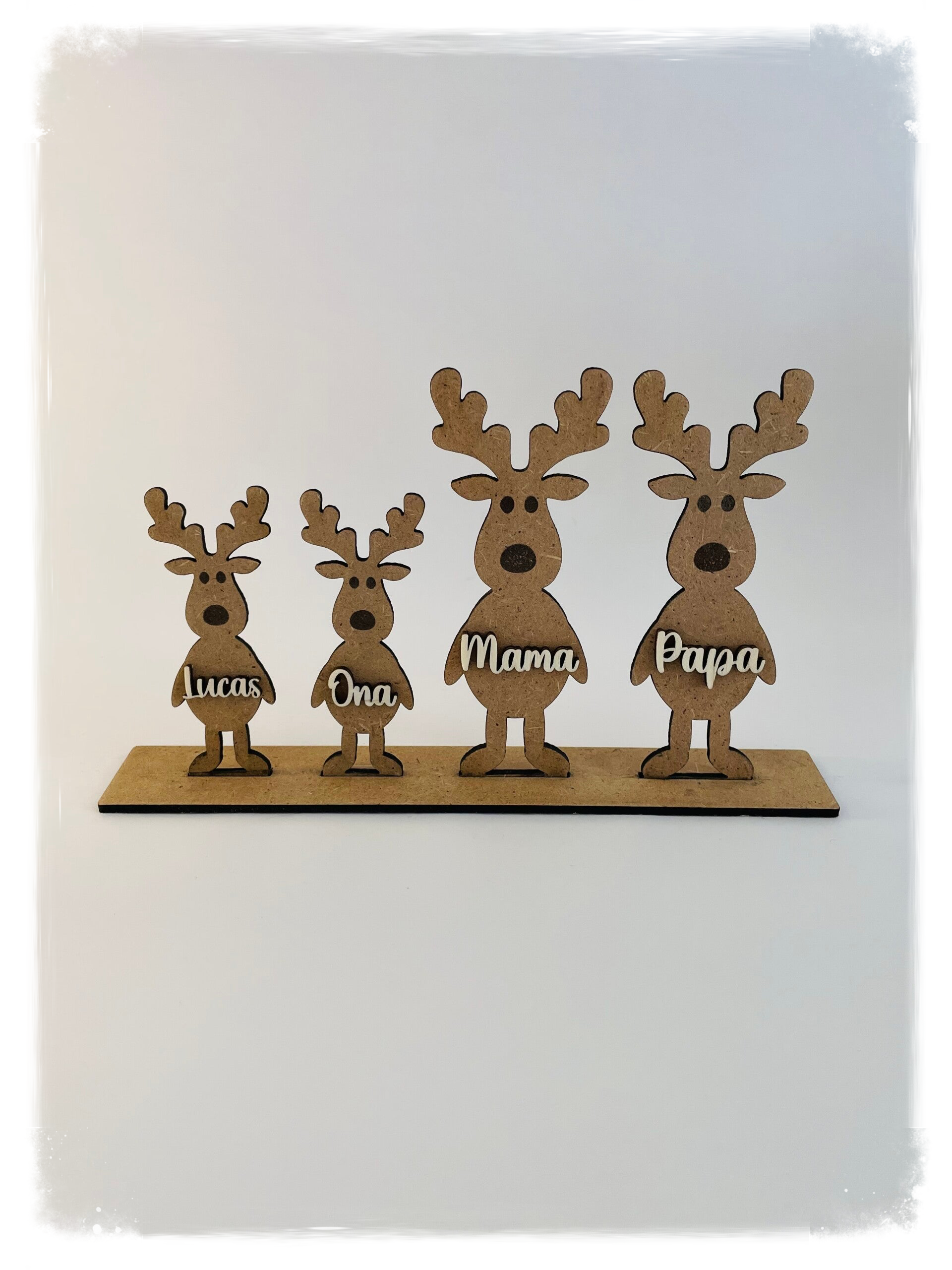 Familia de renos navideños de madera configurable, con nombres en relieve.