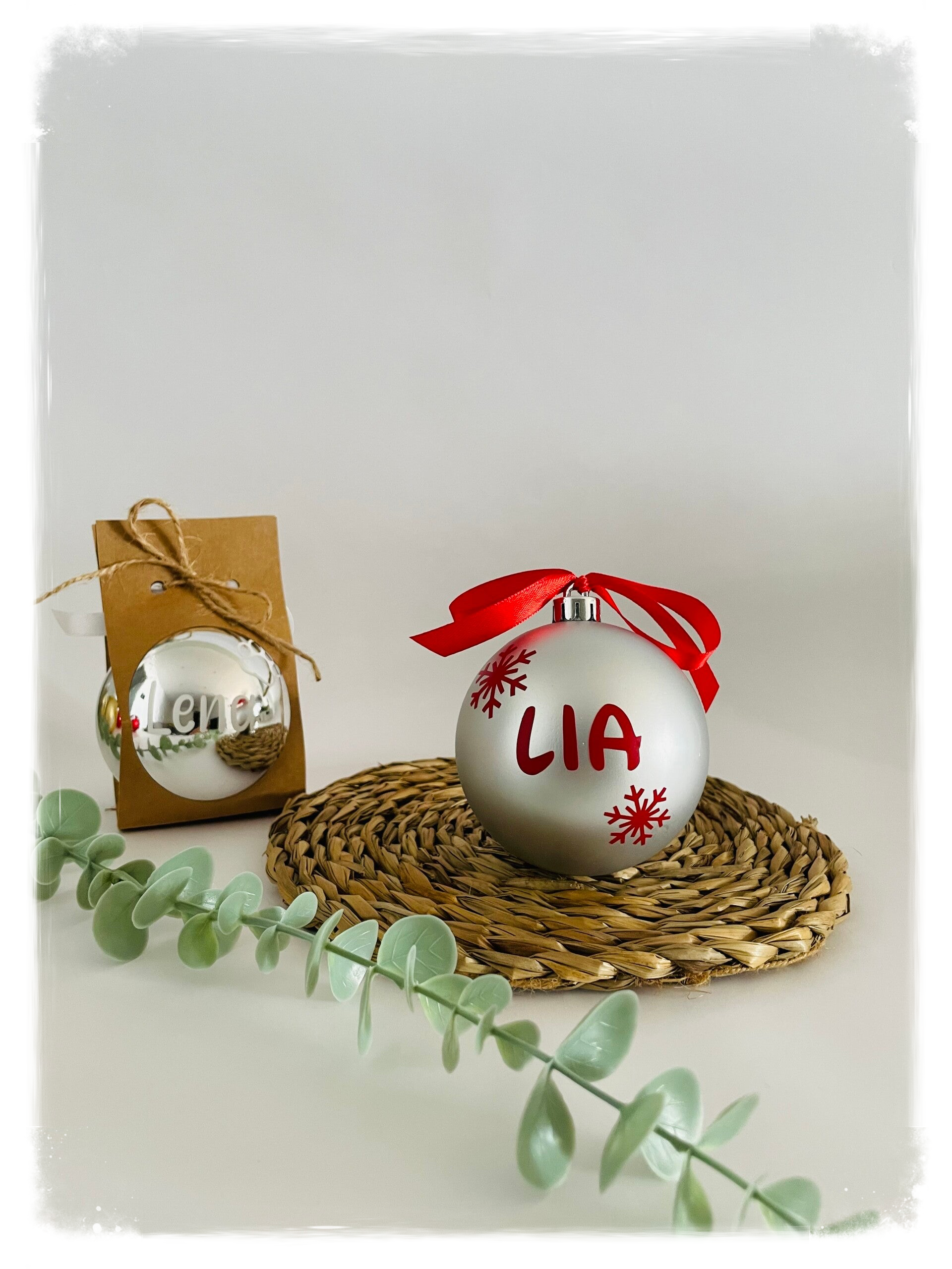 Bola de Navidad plateada de 8cm de diámetro, personalizada con nombre en vinilo blanco.