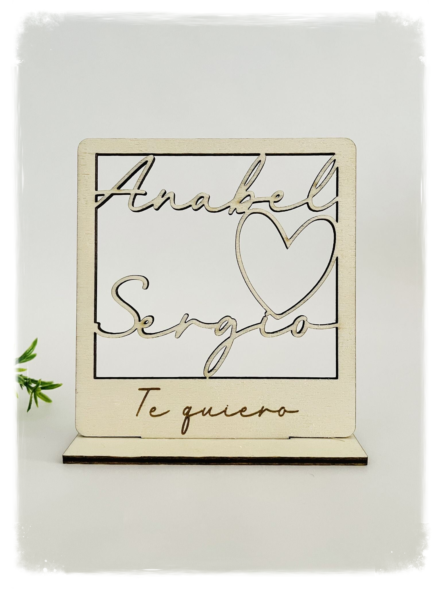 Placa de madera con base, personalizada con la silueta de dos nombres.