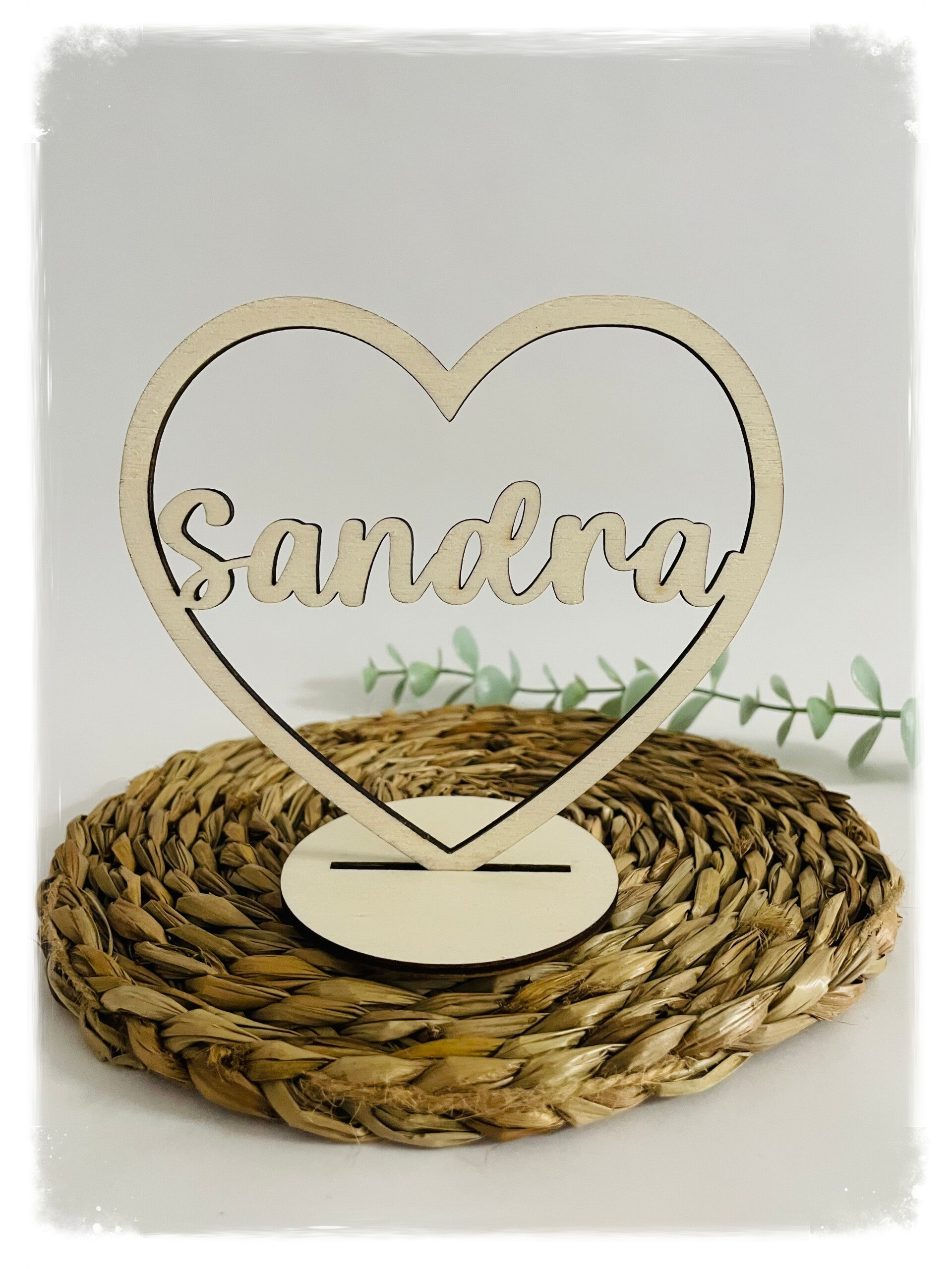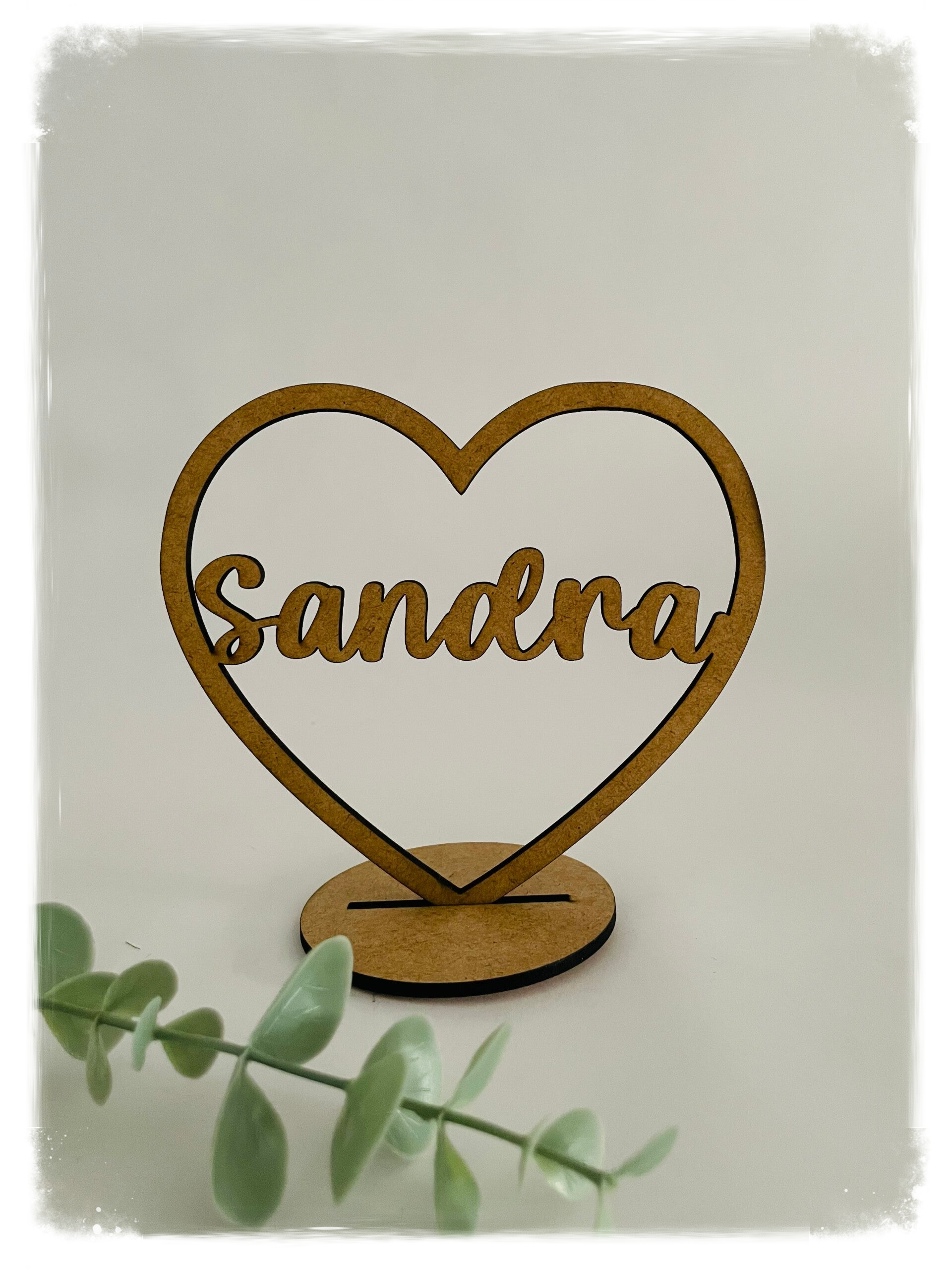 Placa de madera con base, personalizada con la silueta de dos nombres.