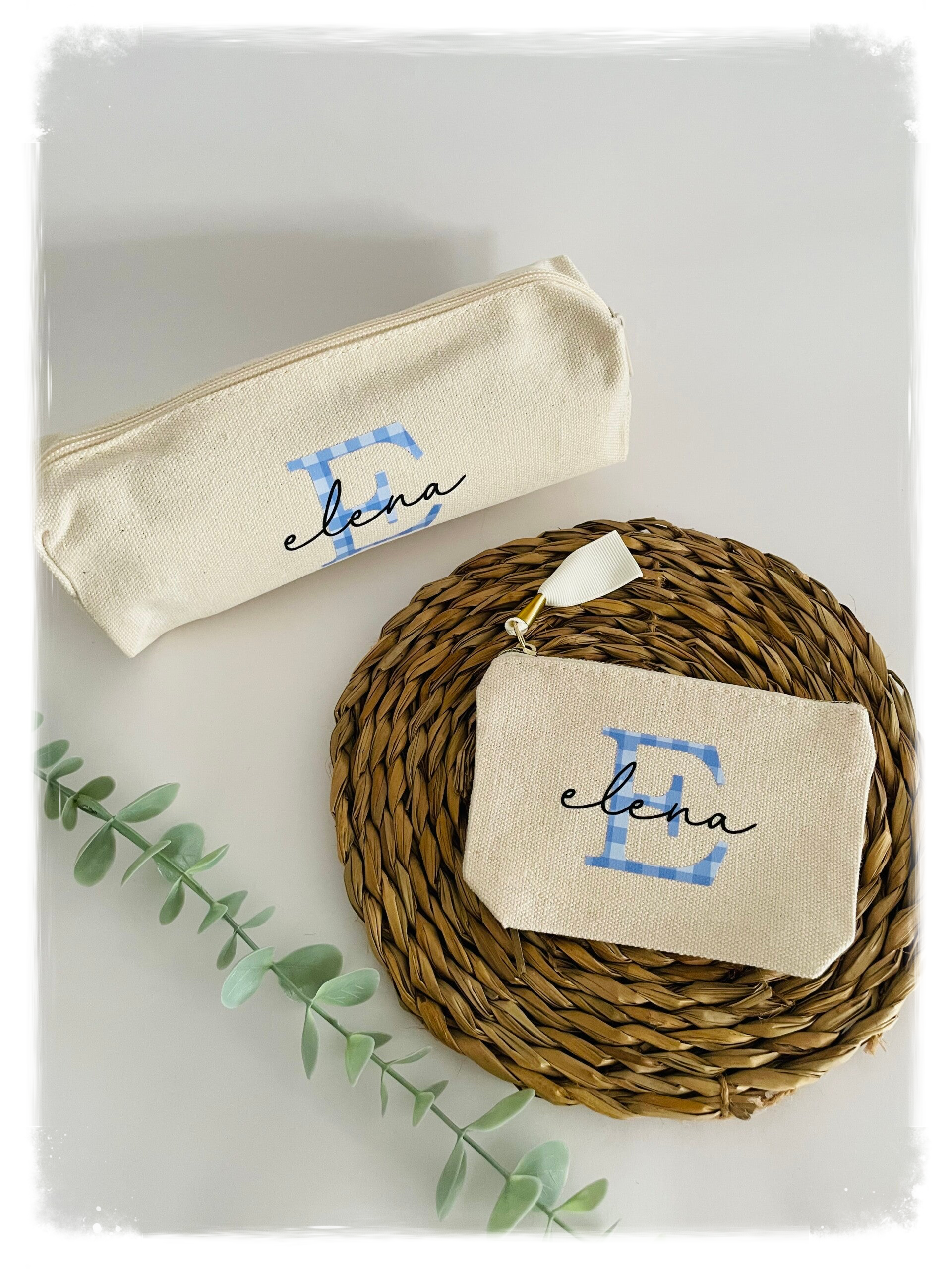 Pack personalizado con inicial en cuadros vichy (disponible en 6 colores) y nombre, con los siguientes artículos: