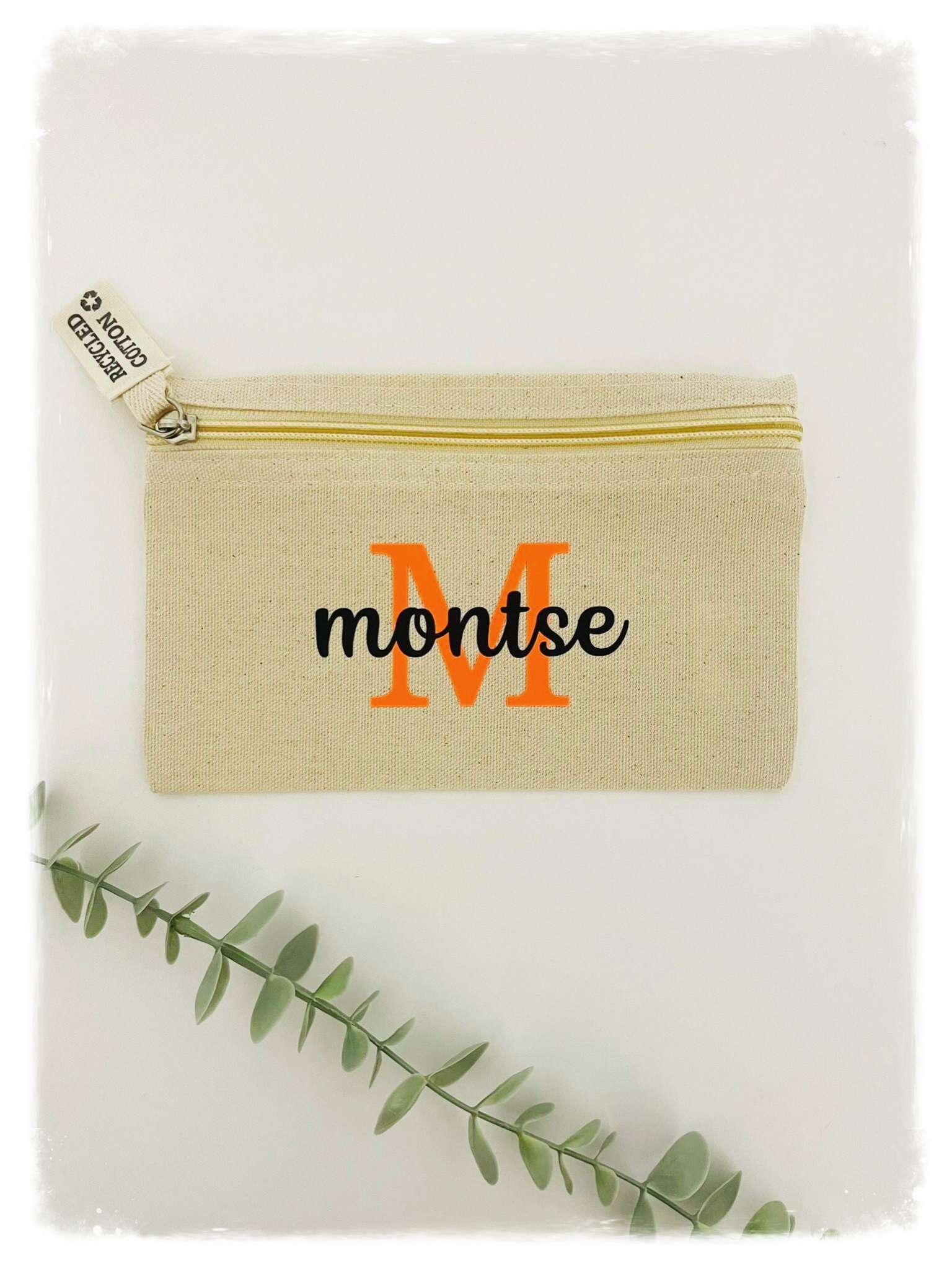 Estuche de algodón reciclado de 220gr/m2, personalizado con inicial y nombre.