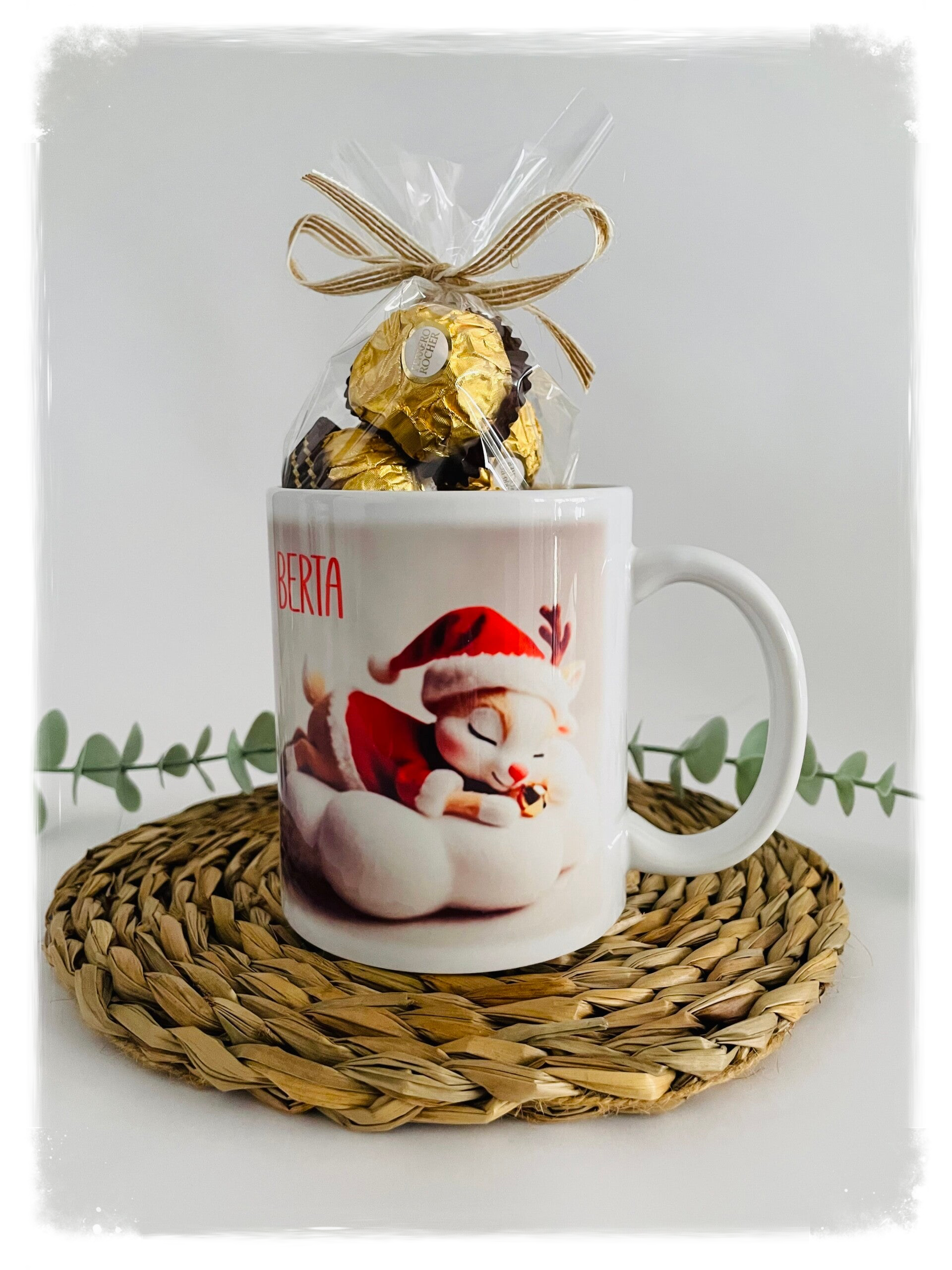 Taza navideña blanca de 325ml con acabado brillo, personalizada con nombre o frase, rellena con bombones o gominolas.