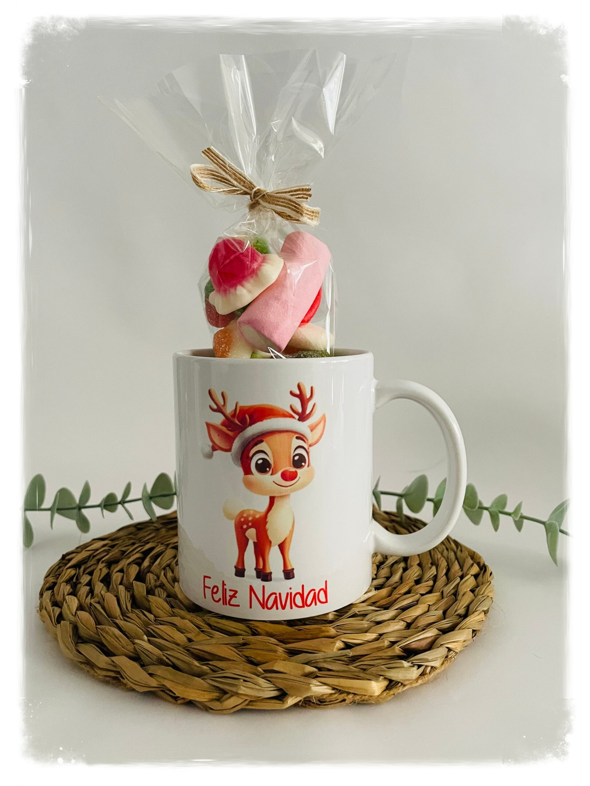 Taza navideña blanca de 325ml con acabado brillo, personalizada con nombre o frase, rellena con bombones o gominolas.