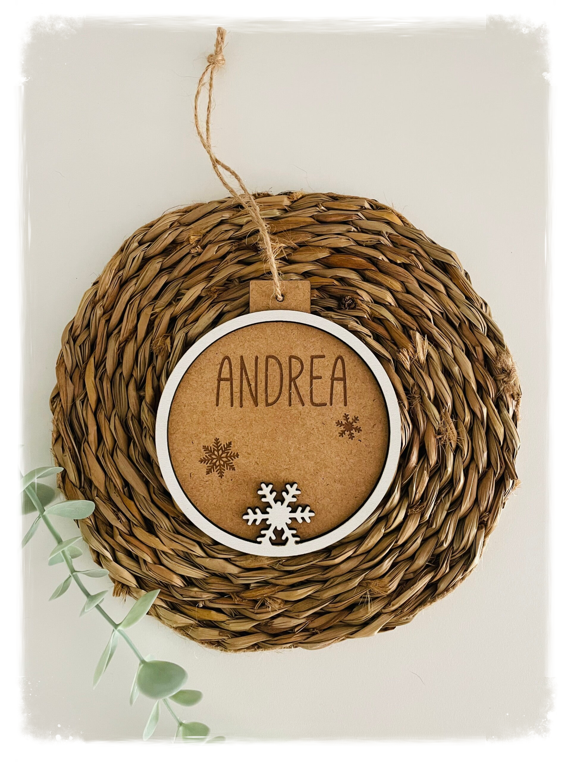 Bola de madera de Navidad de 10cm, con copo de nieve en relieve, personalizada con nombre.