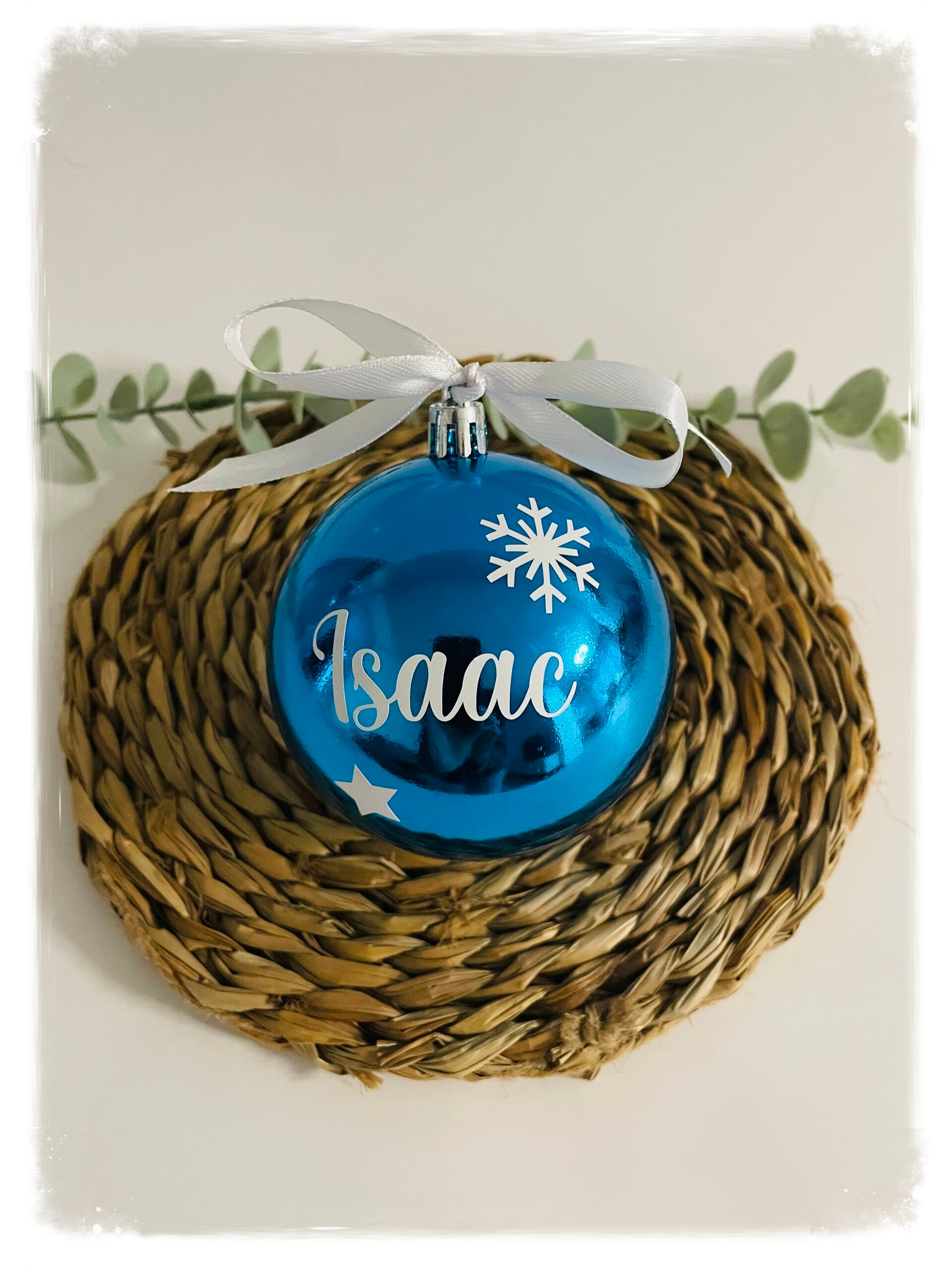 Bola de Navidad azul de 8cm de diámetro, personalizada con nombre en vinilo blanco.