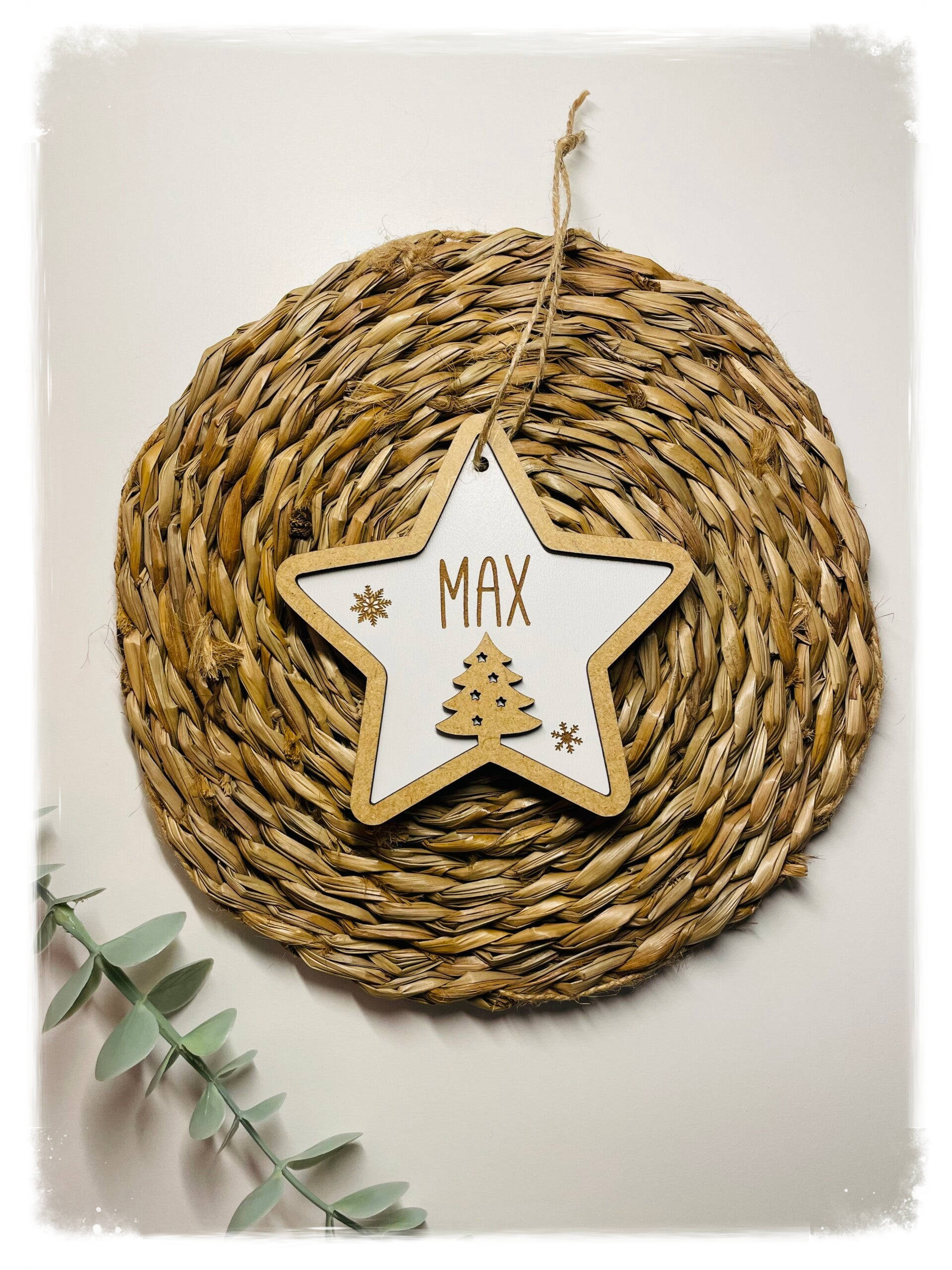 Estrella de madera de Navidad de 10cm, con arbolito en relieve, personalizada con nombre.