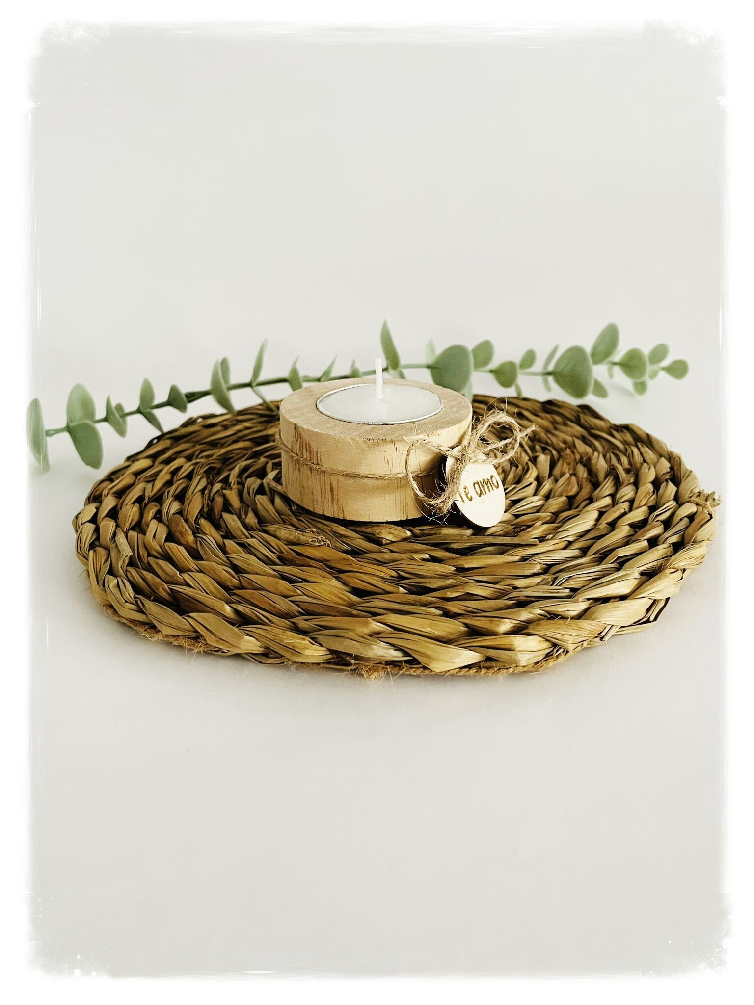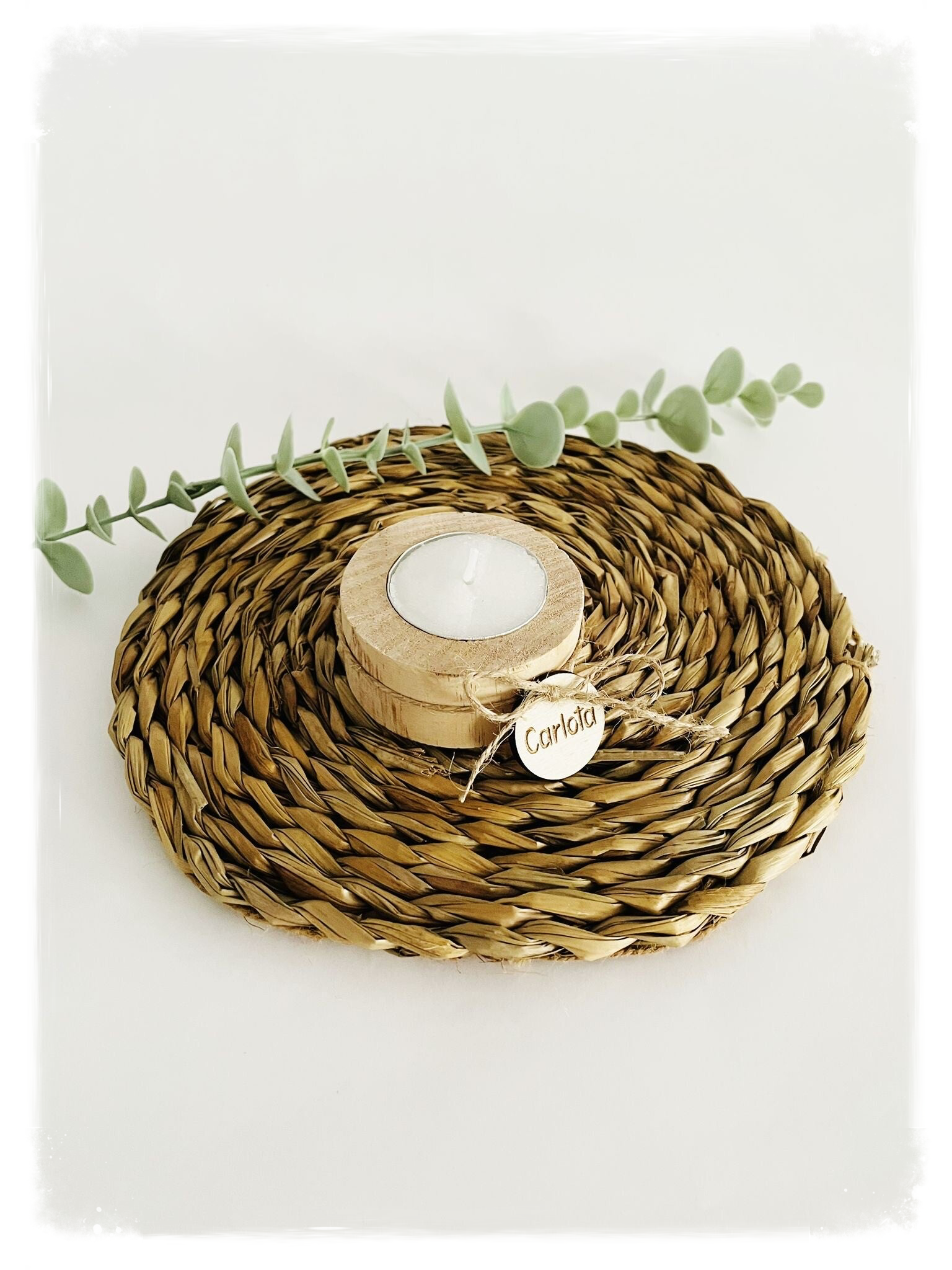 Vela de madera artesanal con lazo, con etiqueta de madera personalizada con nombre o frase.