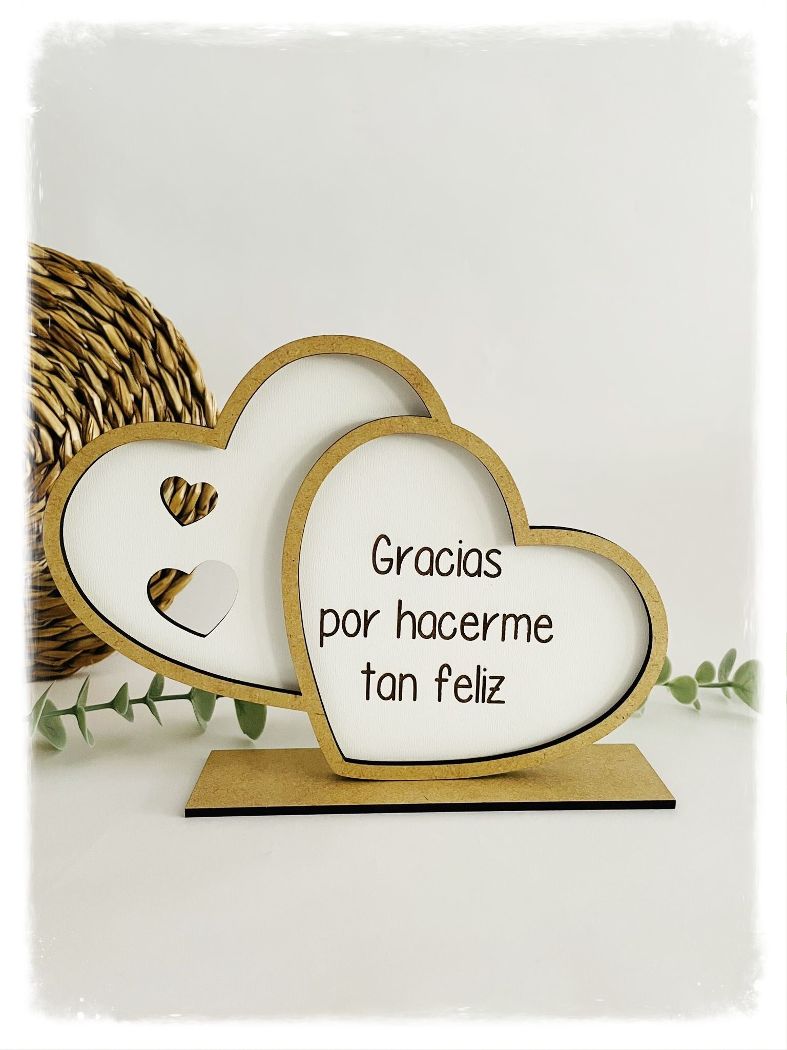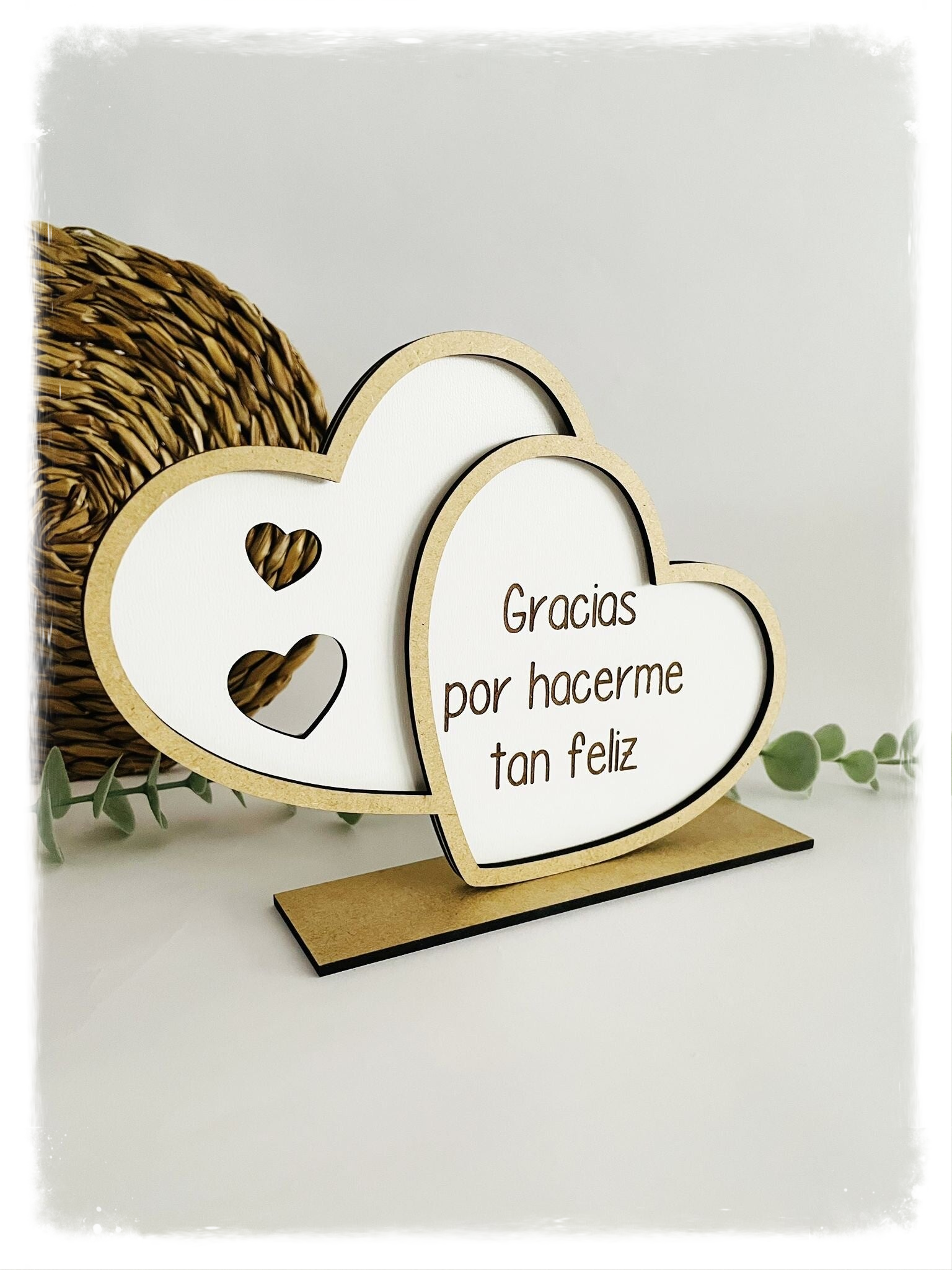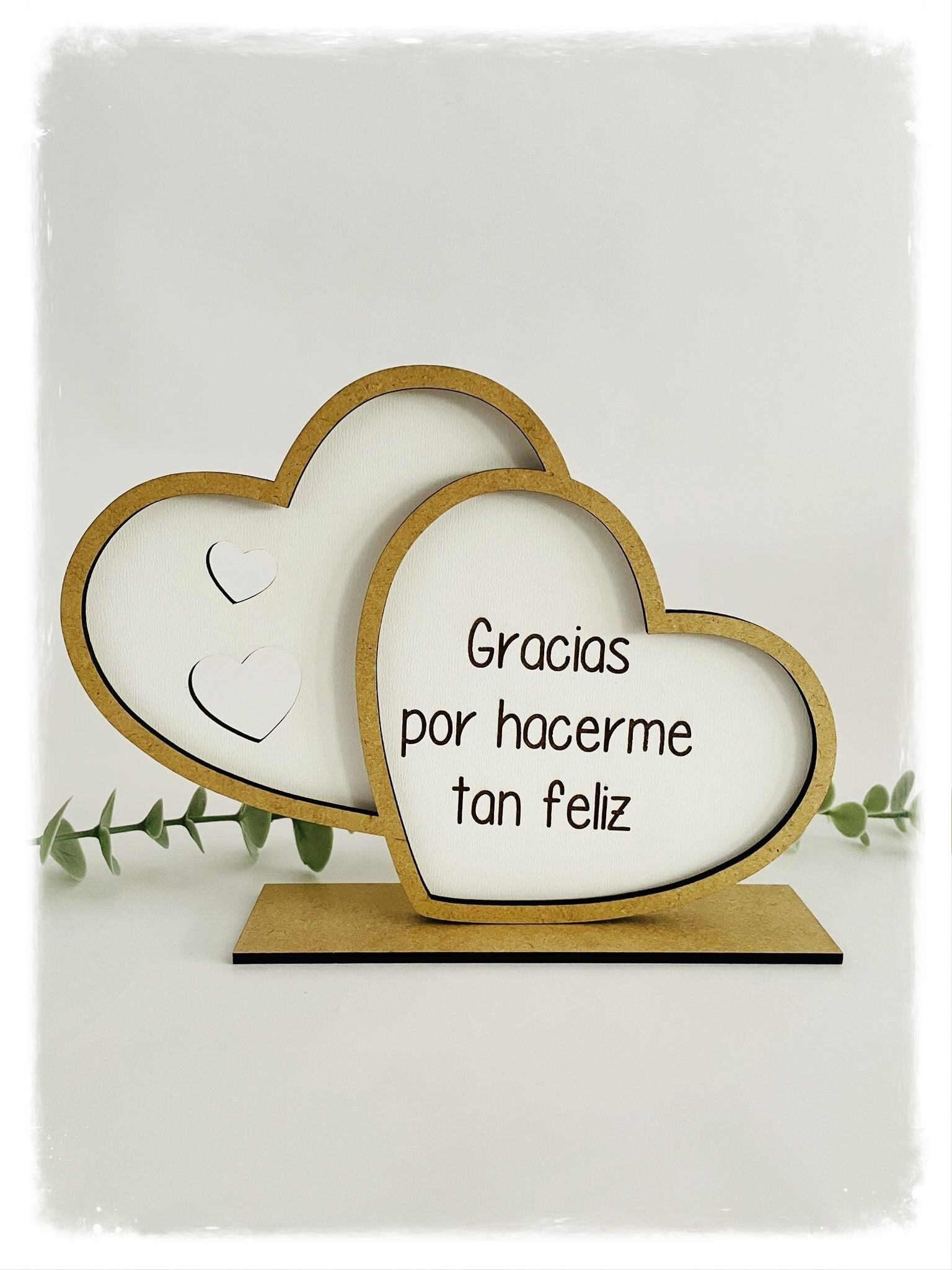 Placa de madera blanca en forma de corazones, personalizada con nombre o texto.