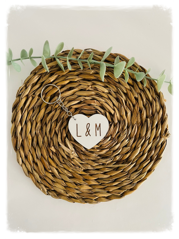 Llavero de madera en forma de corazón, personalizado con nombre o frase grabados a láser.