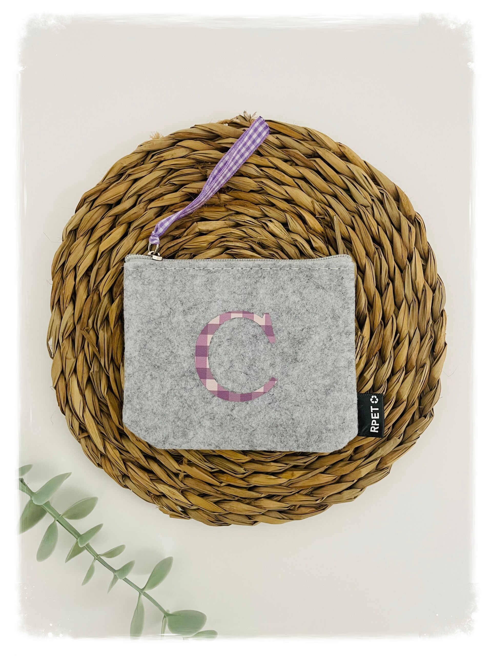 Monedero de fieltro poliéster RPET con cremallera, personalizado con inicial y tirador a conjunto de cuadros Vichy.