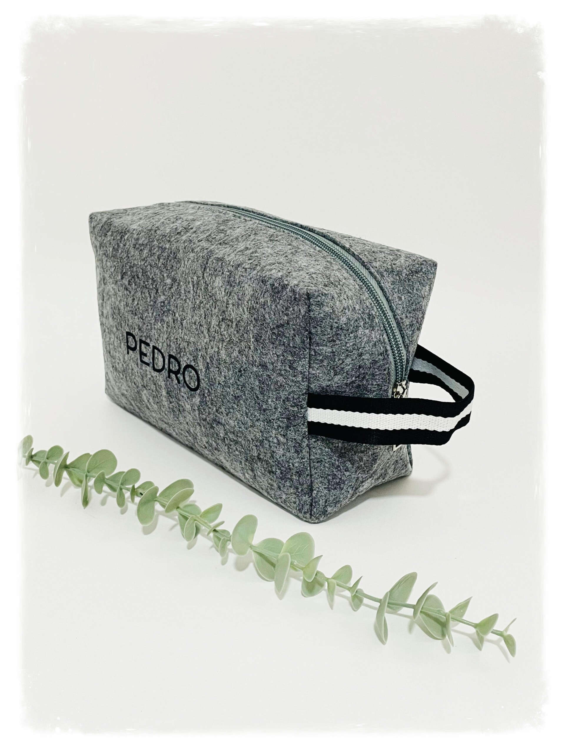 Neceser fabricado en fieltro RPET de 360 gr/m2 de gran capacidad con asa para óptimo agarre.