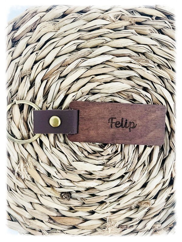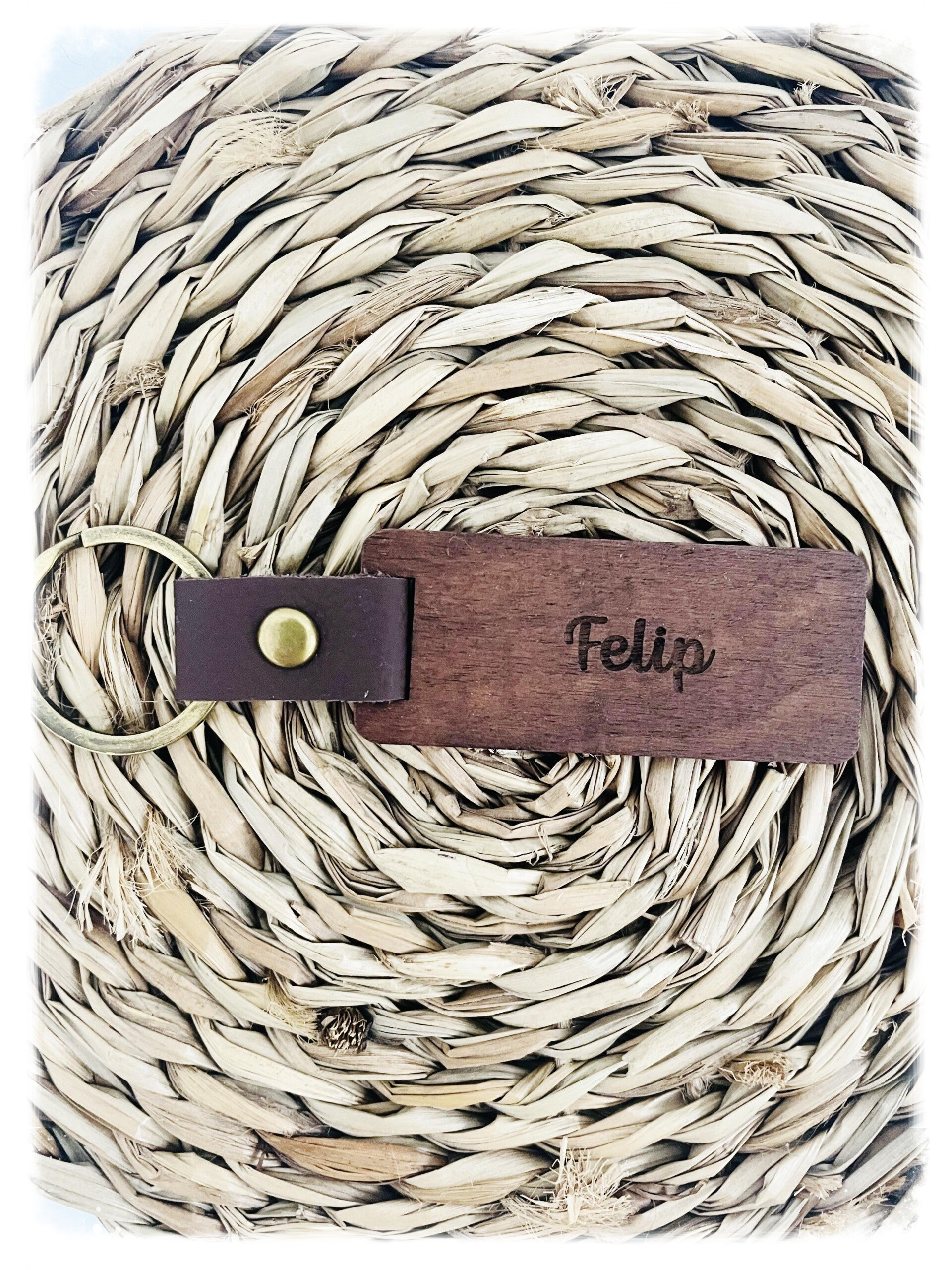 Llavero de madera de nogal, personalizado con nombre grabado a láser.