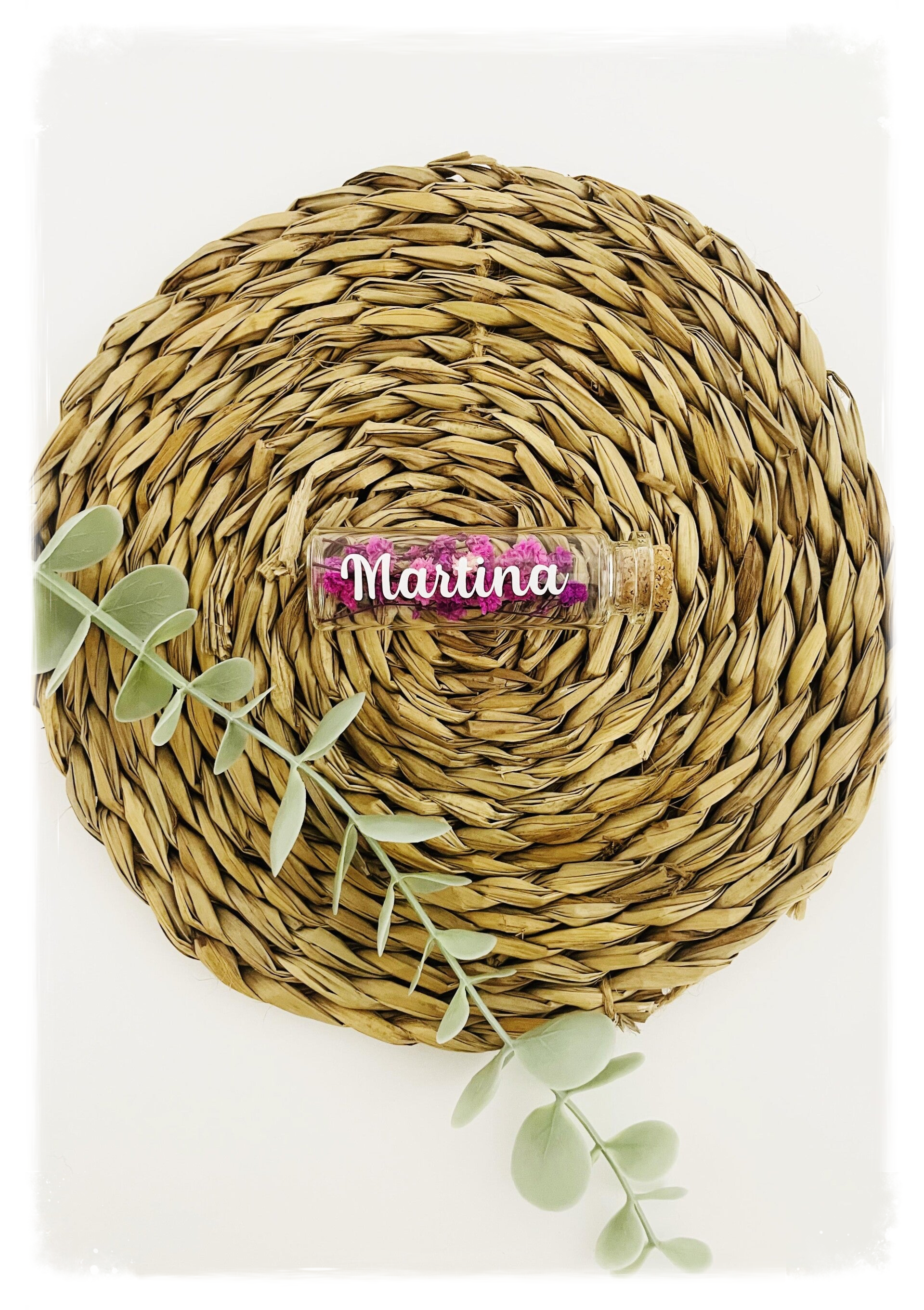 Botellita de cristal con tapón de corcho, personalizada con nombre y rellena de flores preservadas.