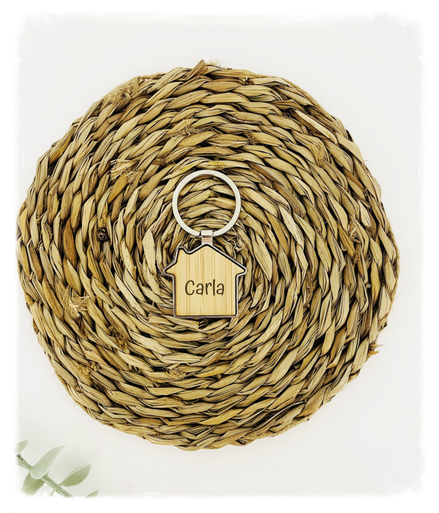 Llavero con forma de casa de línea nature, en combinación de materiales metal de acabado brillante y bambú, personalizado con nombre o frase grabado a láser.