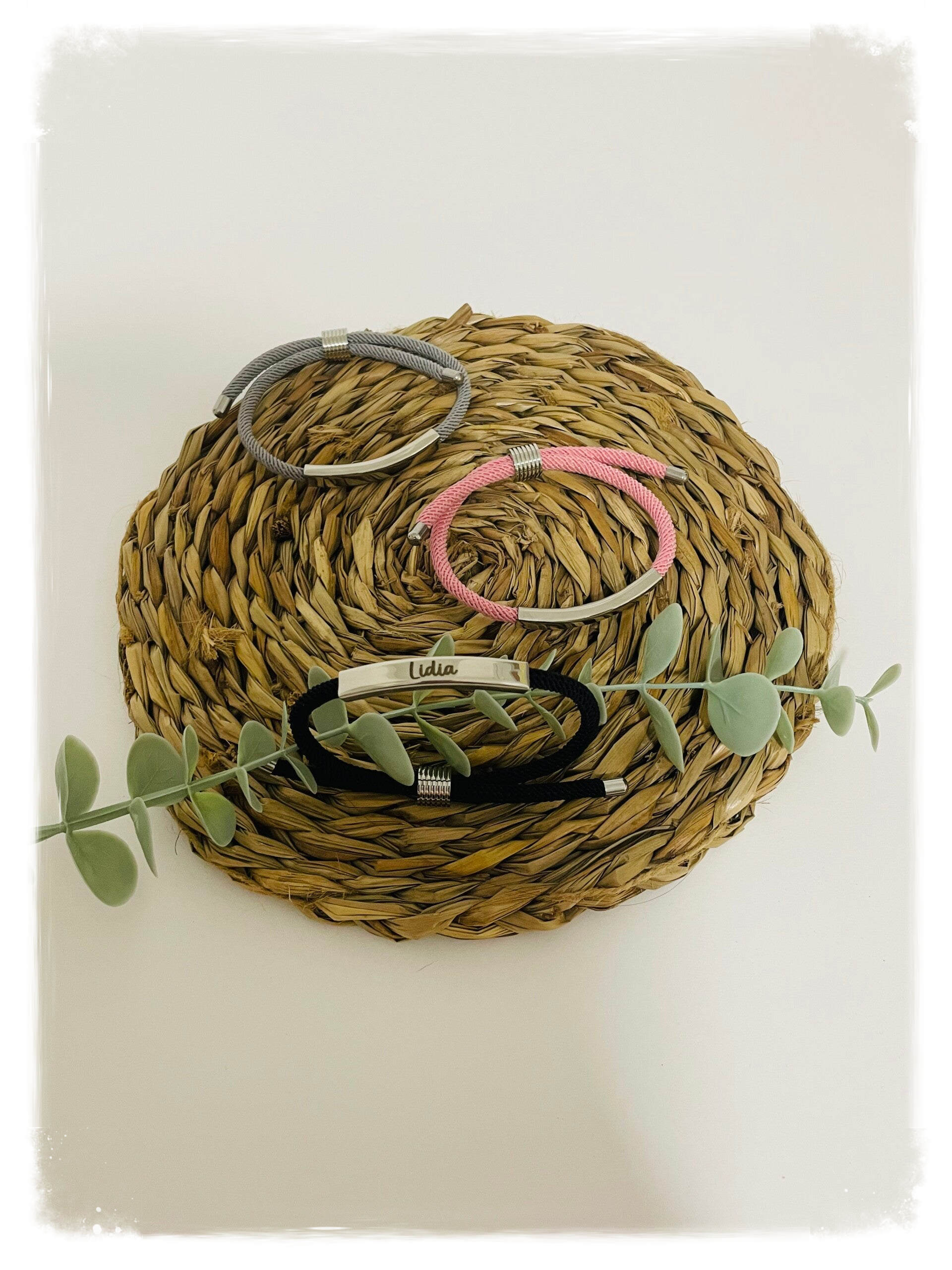 Pulsera con cuerda de hilo de algodón y placa de acero inoxidable, personalizada con nombre.
