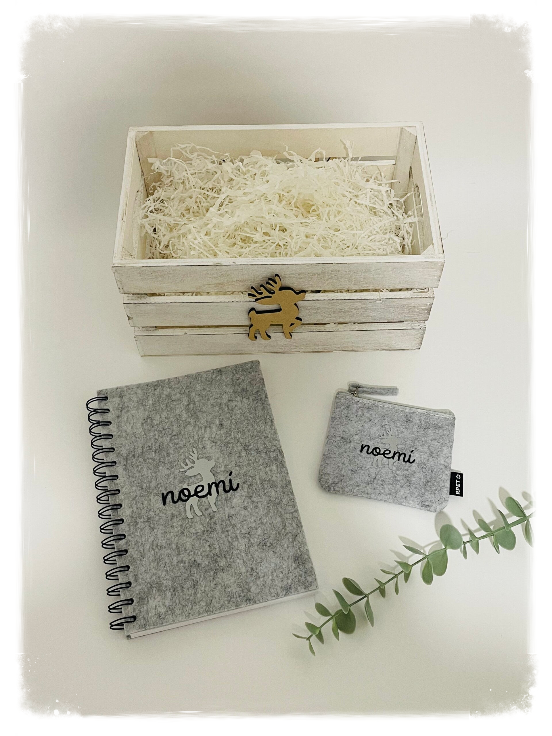 Pack con caja de madera personalizado con reno plateado y nombre con: