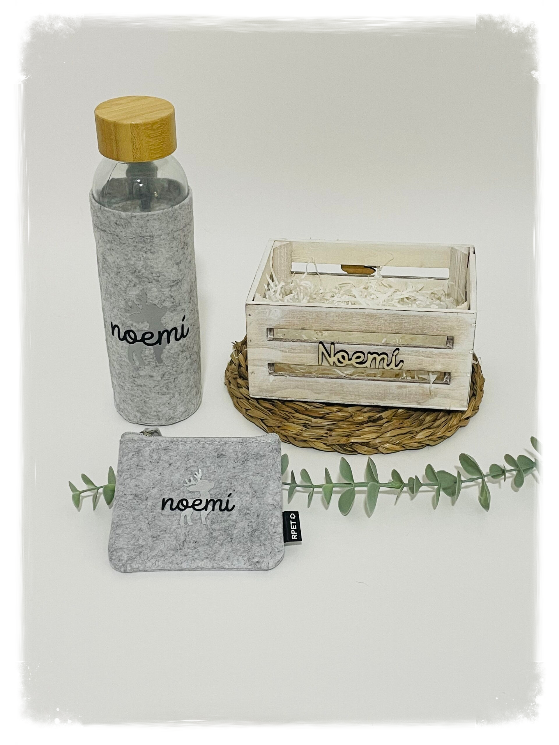 Botella de cristal de 500ml de capacidad, con funda de fieltro RPET personalizada con reno plateado y nombre. Tapón de rosca de bambú natural y asa de transporte. Libre de BPA. Medidas: 23cm de alto