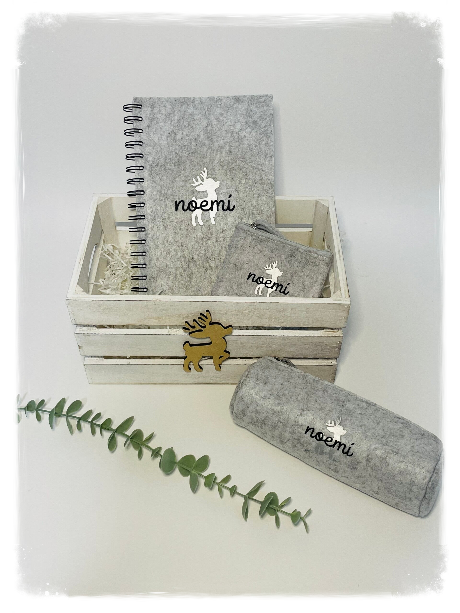 Libreta DINA5 de anillas con tapas de fieltro RPET de color gris, personalizada con reno plateado y nombre. Consta de 100 hojas con rayas. Medidas: 15.5 x 21 x 1.5 cm | 230 gr.