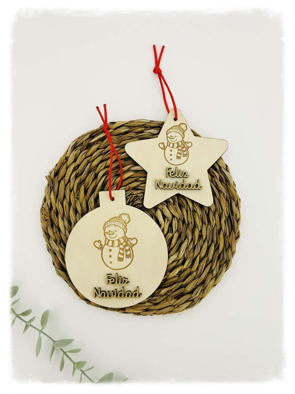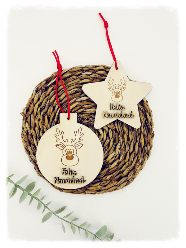 Adorno navideño de madera en forma de estrella o bola, personalizado conFeliz Navidad en el idioma que desee.