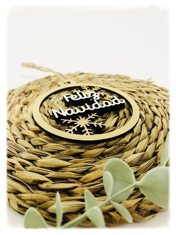 Bola de madera de Navidad de 10cm, personalizada con Feliz Navidad en relieve.