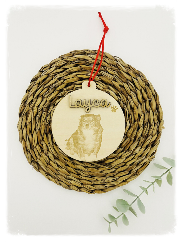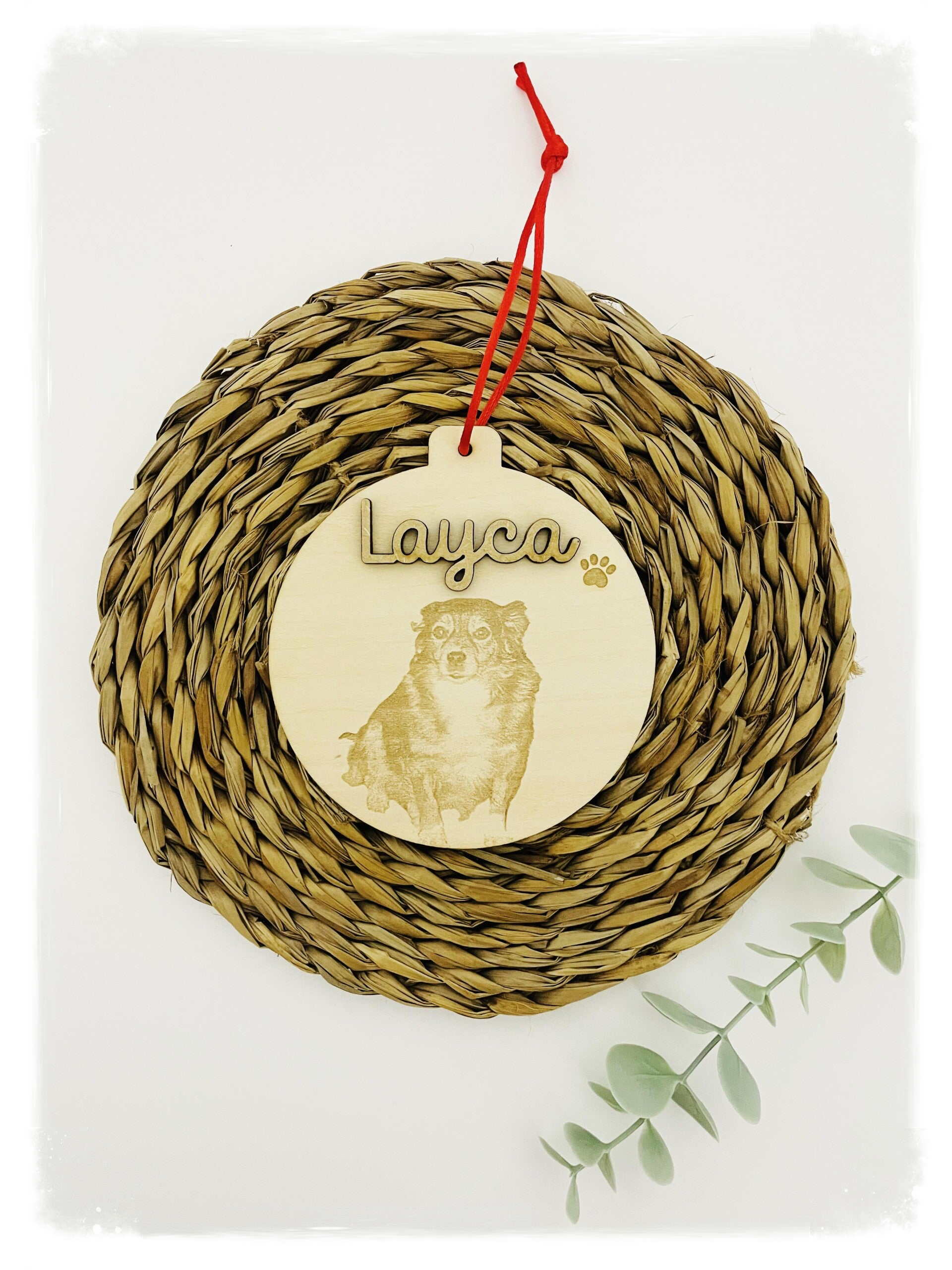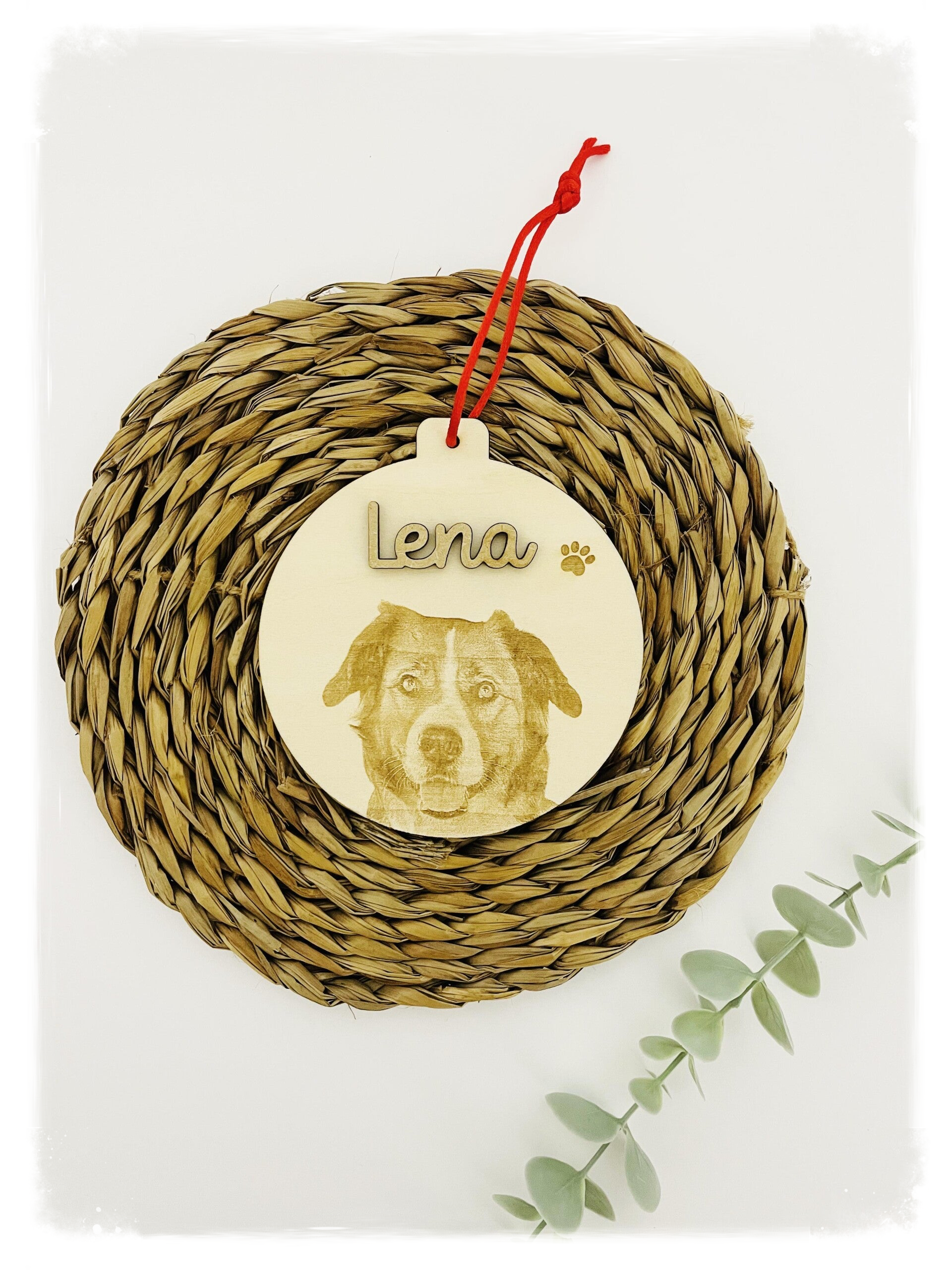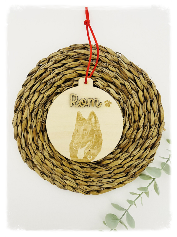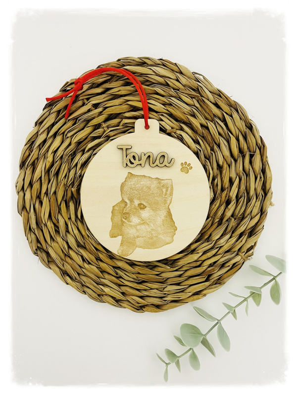 Bola de adorno para el árbol de Navidad, o como elemento decorativo, con foto grabada a láser, con una huella, y con el nombre en relieve.