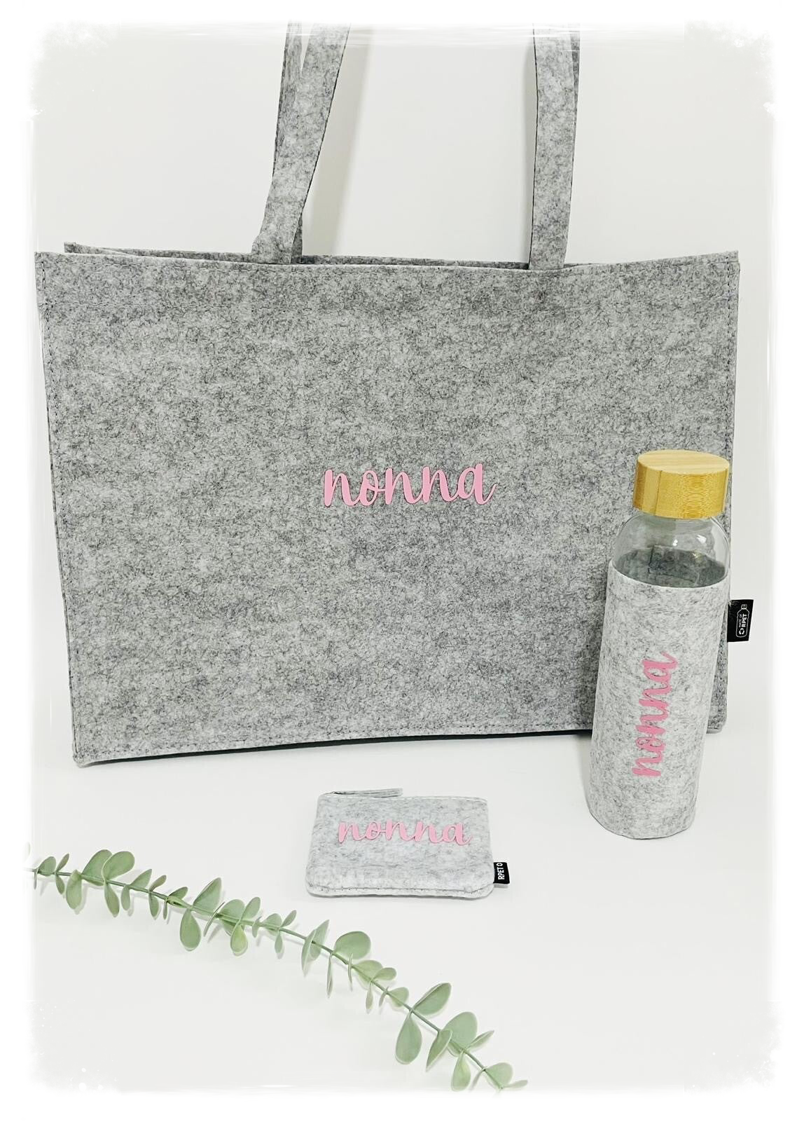 - botella de cristal de 500ml de capacidad, con funda de fieltro RPET, tapón de rosca de bambú natural y asa de transporte. Libre de BPA (23cm)