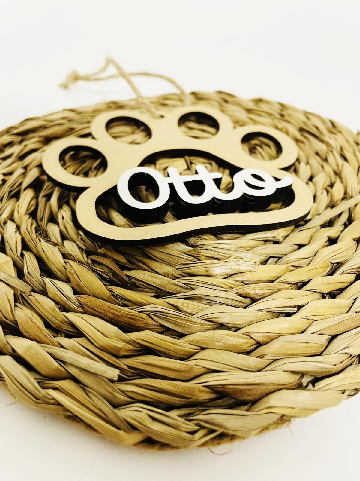 Adorno en forma de huella con nombre en relieve personalizado para el árbol de Navidad o como elemento decorativo.